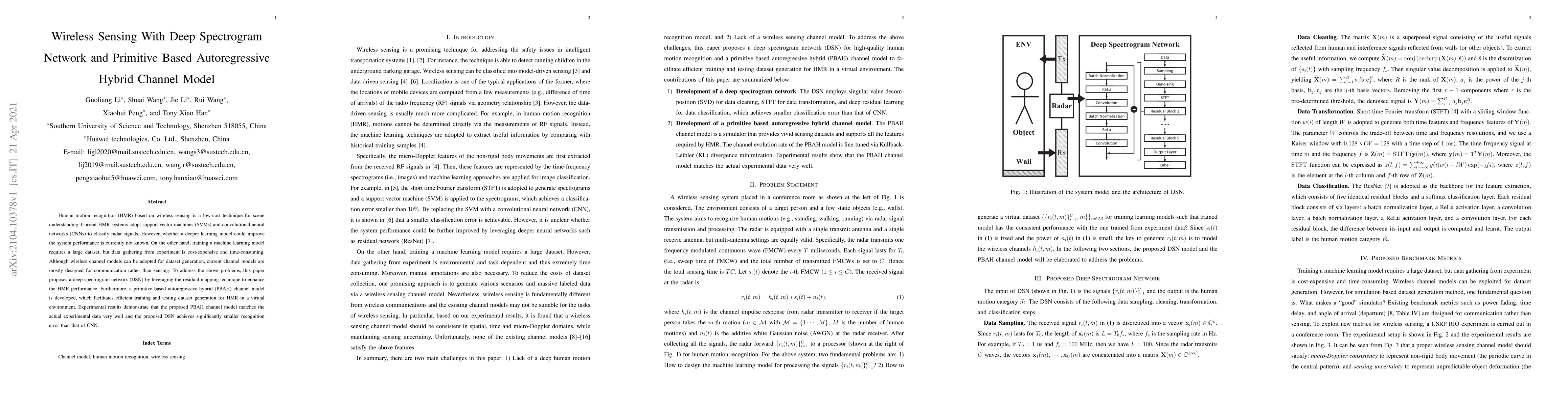 This paper proposes a deep spectrogram network (DSN) to enhance human motion recognition (HMR) using wireless sensing, and introduces a primitive based autoregressive hybrid (PBAH) channel model for efficient dataset generation. Experimental results show that the DSN outperforms CNNs and the PBAH model accurately replicates real data.