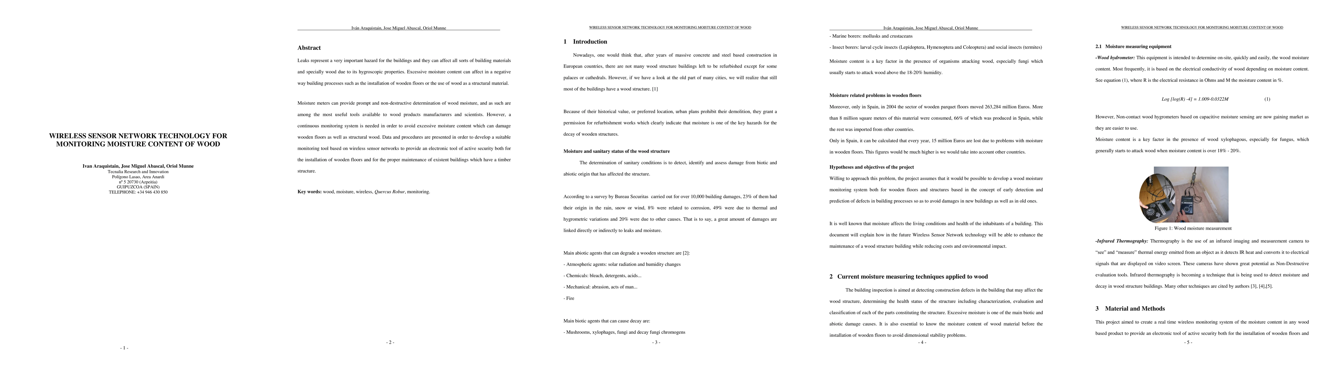 This paper proposes a wireless sensor network system for continuous moisture monitoring of wood to prevent damage from excessive moisture content. It aims to provide an electronic tool for active security in wooden floor installations and building maintenance.