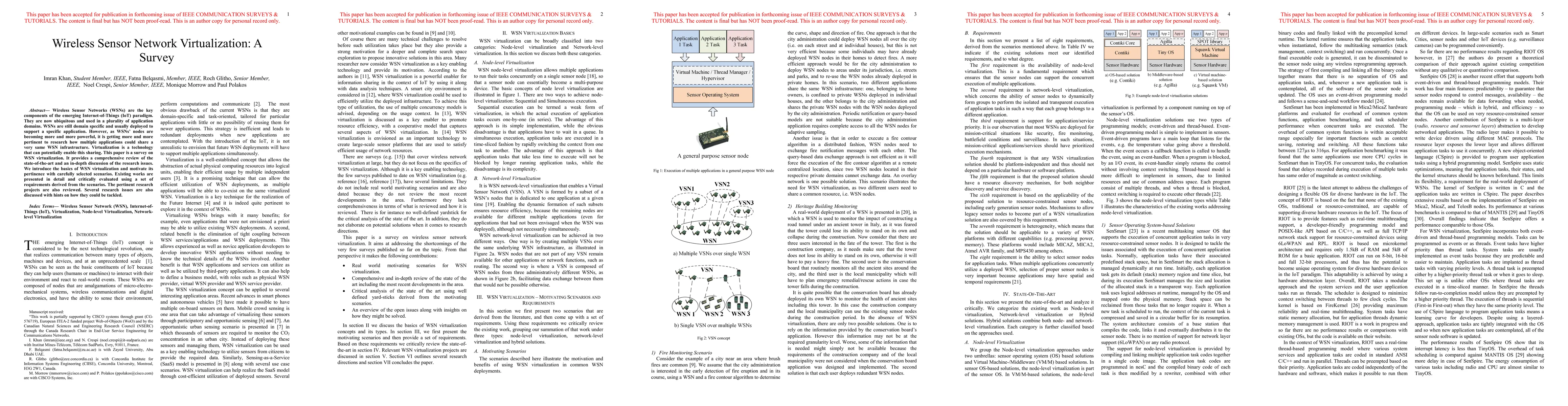 This paper surveys wireless sensor network virtualization, exploring its potential to enable multiple applications to share the same WSN infrastructure. It provides a comprehensive review of existing works, evaluates them against derived requirements, and discusses pertinent research issues and projects.