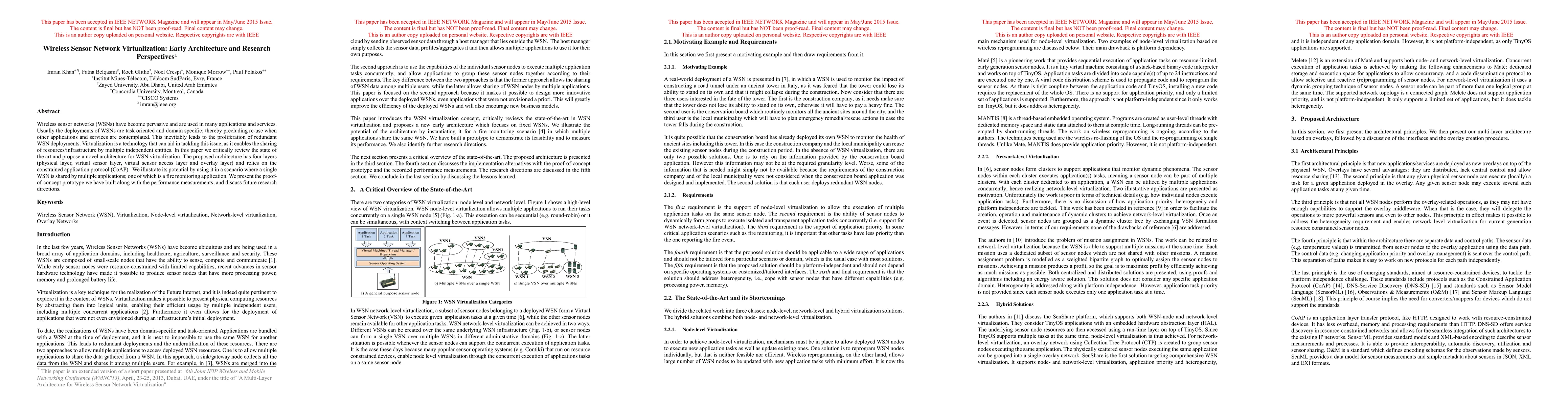 This paper reviews the state of wireless sensor network (WSN) virtualization and proposes a novel four-layer architecture to enable resource sharing across multiple applications. The prototype demonstrates the architecture's potential in a fire monitoring scenario, highlighting performance metrics and future research directions.