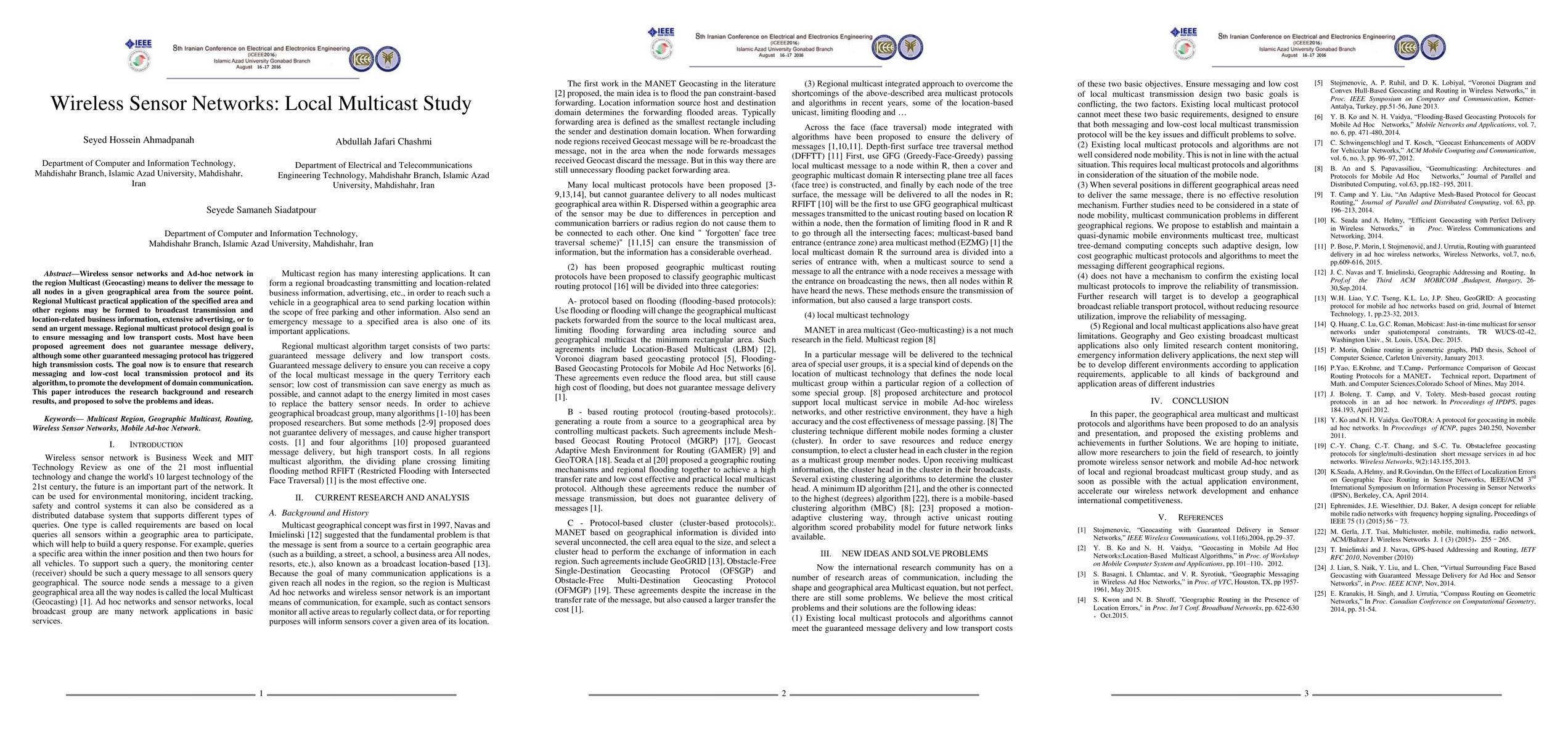 Wireless sensor networks and Ad-hoc network in the region Multicast (Geocasting) means to deliver the message to all nodes in a given geographical area from the source point. Regional Multicast practical application of the specified area and other regions may be formed to broadcast transmission and location-related business information, extensive advertising, or to send an urgent message. Regional multicast protocol design goal is to ensure messaging and low transport costs. Most have been proposed agreement does not guarantee message delivery, although some other guaranteed messaging protocol has triggered high transmission costs. The goal now is to ensure that research messaging and low-cost local transmission protocol and its algorithm, to promote the development of domain communication. This paper introduces the research background and research results, and proposed to solve the problems and ideas.