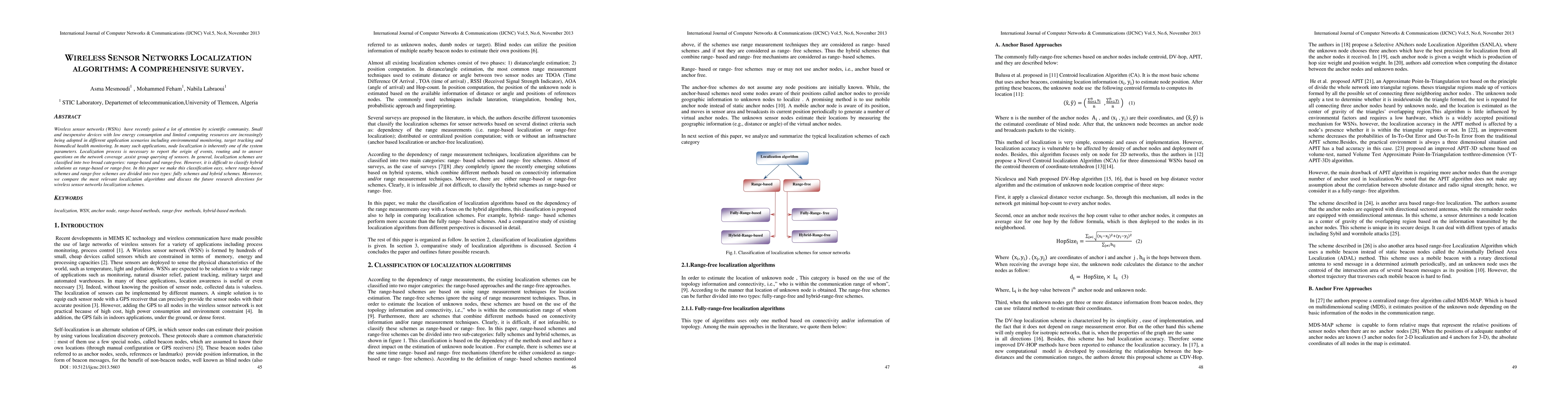This paper provides a comprehensive survey of localization algorithms in wireless sensor networks (WSNs), categorizing them into range-based, range-free, fully, and hybrid schemes. It compares prominent algorithms and outlines future research directions for WSN localization.