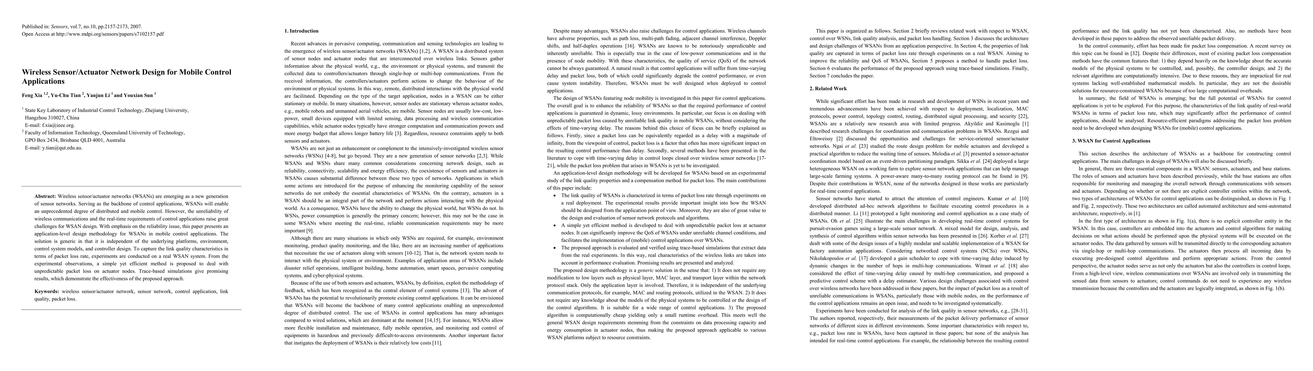 This paper proposes an application-level design methodology for wireless sensor/actuator networks (WSANs) to enhance reliability in mobile control applications, addressing the challenges of wireless communication unreliability. Experimental results and trace-based simulations validate an efficient method to manage unpredictable packet loss on actuator nodes, demonstrating the approach's effectiveness.