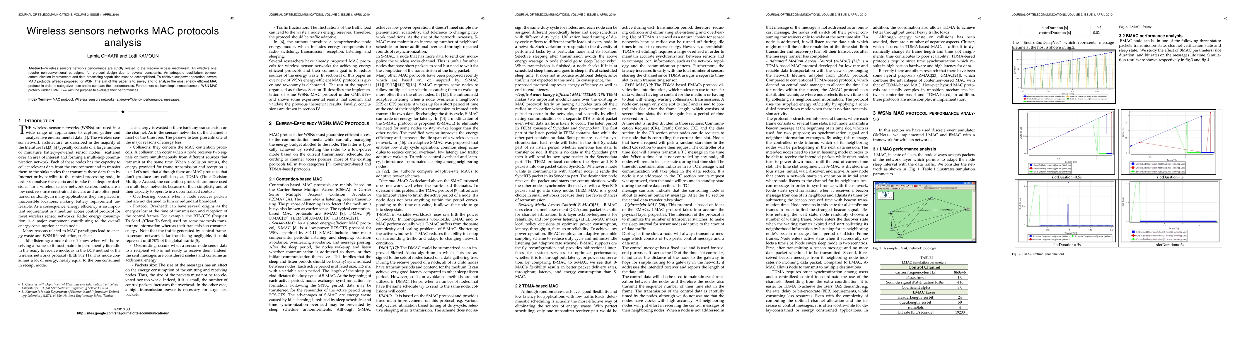 This paper surveys and analyzes energy-efficient MAC protocols for wireless sensor networks, aiming to categorize and compare their performance. The authors implemented several protocols in OMNET++ to evaluate their effectiveness in low power operation.