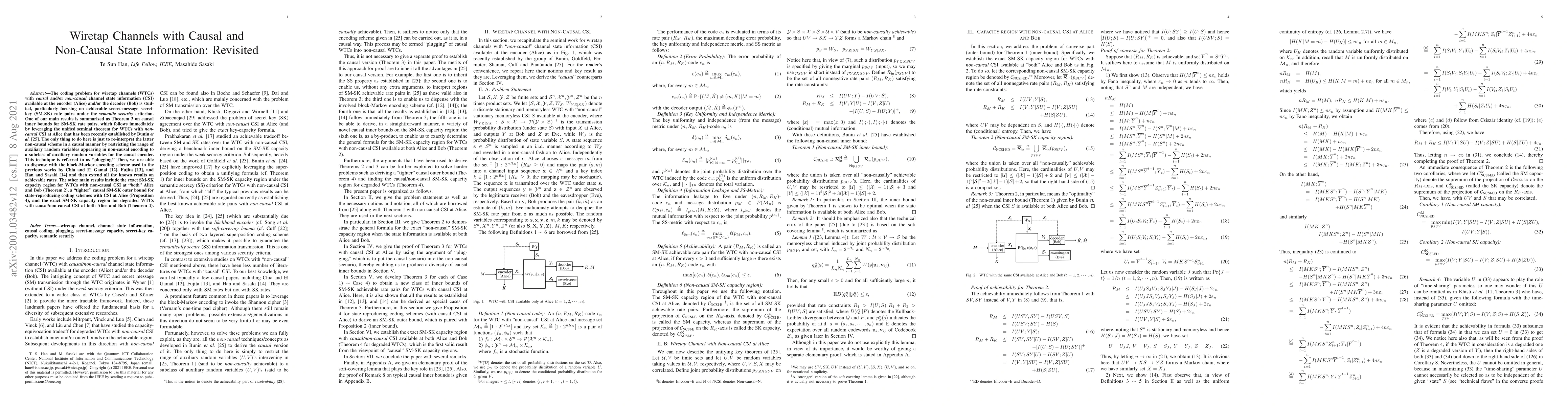 The coding problem for wiretap channels with causal channel state information (CSI) available at the encoder (Alice) and/or the decoder (Bob) is studied. We are concerned here particularily with the problem of achievable secret-message secret-key rate pairs under the semantic security criterion. Our main result extends all the previous results on achievable rates as given by Chia and El Gamal [10], Fujita [11], and Han and Sasaki [23]. In order to do this, we first derive a unifying theorem (Theorem 2) with causal CSI at Alice, which follows immediately by leveraging the unifying seminal theorem for wiretap channels with non-causal CSI at Alice as recently established by Bunin et al. [22]. The only thing to do here is just to re-interpret the latter non-causal one in a causal manner. A prominent feature of this approach is that we are able to dispense with the block-Markov encoding scheme as used in the previous works. Also, the exact secret-message key capacity region for wiretap channels with non-causal CSI at both Alice and Bob is given.