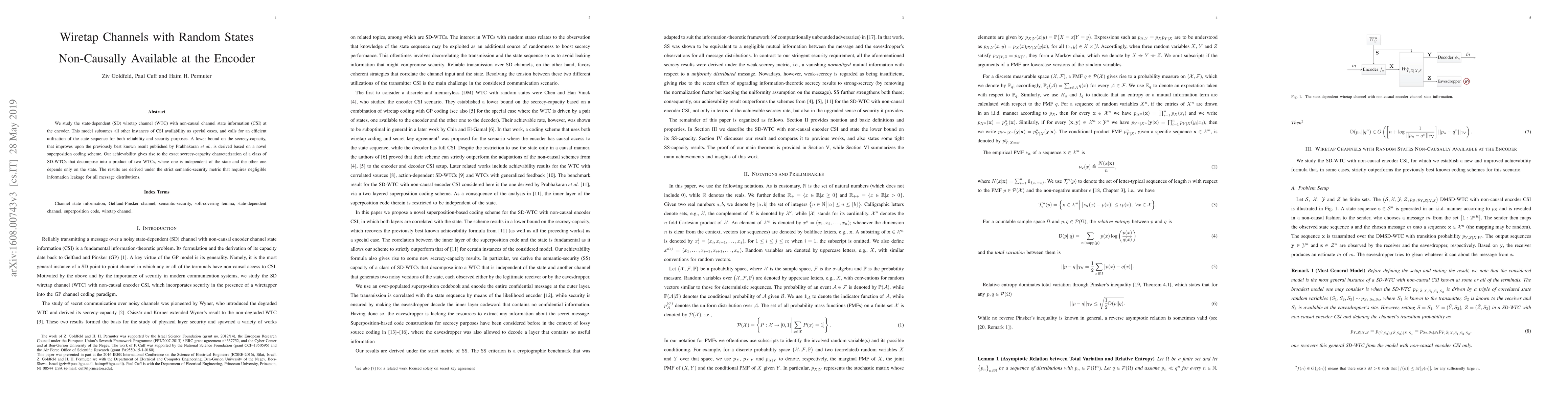 We study the state-dependent (SD) wiretap channel (WTC) with non-causal channel state information (CSI) at the encoder. This model subsumes all other instances of CSI availability as special cases, and calls for an efficient utilization of the state sequence for both reliability and security purposes. A lower bound on the secrecy-capacity, that improves upon the previously best known result published by Prabhakaran et al., is derived based on a novel superposition coding scheme. Our achievability gives rise to the exact secrecy-capacity characterization of a class of SD-WTCs that decompose into a product of two WTCs, where one is independent of the state and the other one depends only on the state. The results are derived under the strict semantic-security metric that requires negligible information leakage for all message distributions.