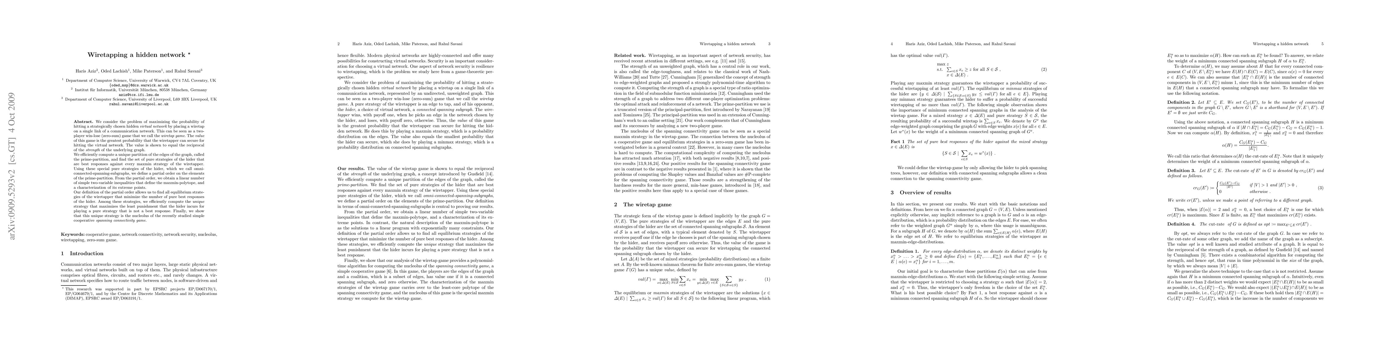 We consider the problem of maximizing the probability of hitting a strategically chosen hidden virtual network by placing a wiretap on a single link of a communication network. This can be seen as a two-player win-lose (zero-sum) game that we call the wiretap game. The value of this game is the greatest probability that the wiretapper can secure for hitting the virtual network. The value is shown to equal the reciprocal of the strength of the underlying graph. We efficiently compute a unique partition of the edges of the graph, called the prime-partition, and find the set of pure strategies of the hider that are best responses against every maxmin strategy of the wiretapper. Using these special pure strategies of the hider, which we call omni-connected-spanning-subgraphs, we define a partial order on the elements of the prime-partition. From the partial order, we obtain a linear number of simple two-variable inequalities that define the maxmin-polytope, and a characterization of its extreme points. Our definition of the partial order allows us to find all equilibrium strategies of the wiretapper that minimize the number of pure best responses of the hider. Among these strategies, we efficiently compute the unique strategy that maximizes the least punishment that the hider incurs for playing a pure strategy that is not a best response. Finally, we show that this unique strategy is the nucleolus of the recently studied simple cooperative spanning connectivity game.