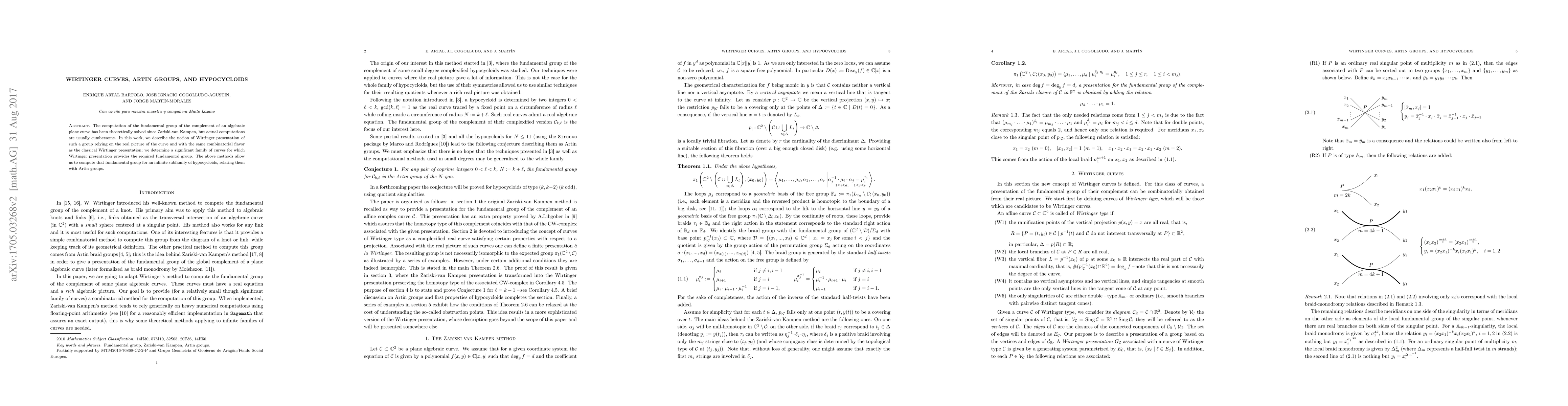 This paper introduces a Wirtinger presentation method for computing the fundamental group of the complement of an algebraic plane curve, demonstrating its application to hypocycloids and linking them to Artin groups. The method simplifies the computation process by leveraging the real picture of the curve.
