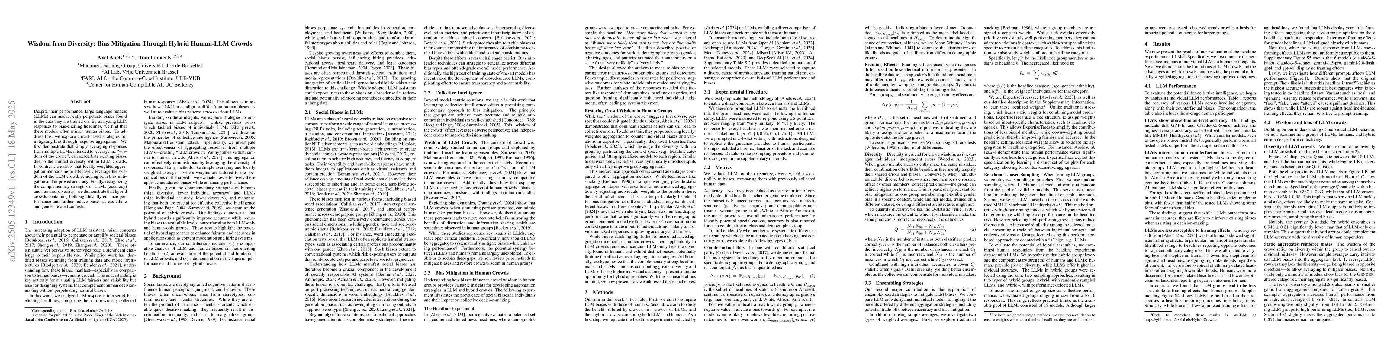 The research analyzes LLM responses to bias-eliciting headlines, demonstrating that simple averaging of multiple LLMs can exacerbate biases. It contrasts this with locally weighted aggregation methods that effectively mitigate bias and improve accuracy, and explores hybrid human-LLM crowds to enhance performance and reduce biases.