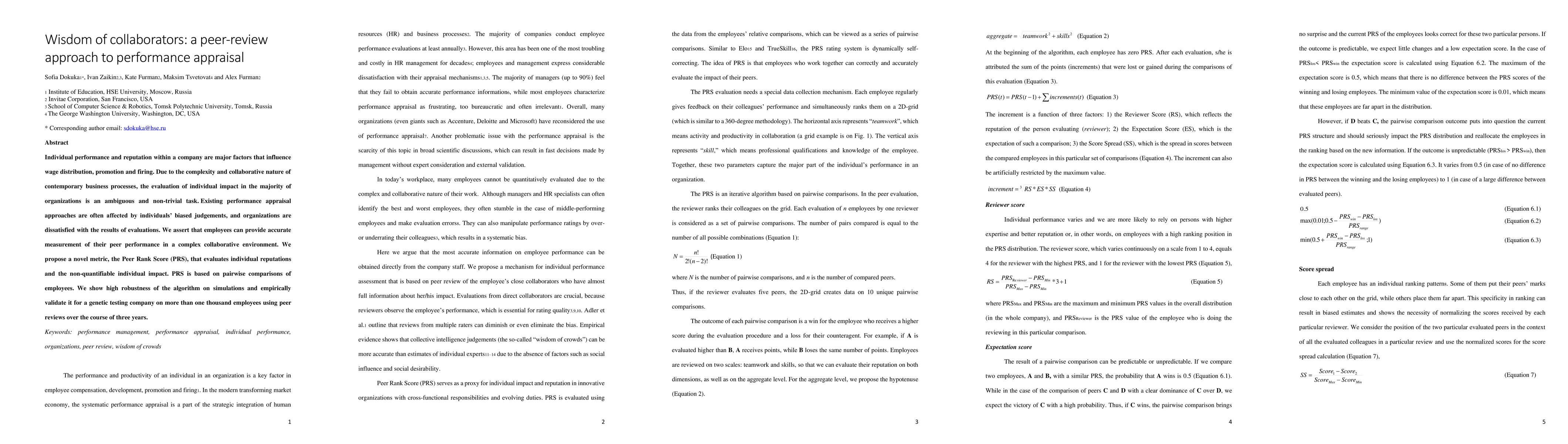 Individual performance and reputation within a company are major factors that influence wage distribution, promotion and firing. Due to the complexity and collaborative nature of contemporary business processes, the evaluation of individual impact in the majority of organizations is an ambiguous and non-trivial task. Existing performance appraisal approaches are often affected by individuals biased judgements, and organizations are dissatisfied with the results of evaluations. We assert that employees can provide accurate measurement of their peer performance in a complex collaborative environment. We propose a novel metric, the Peer Rank Score (PRS), that evaluates individual reputations and the non-quantifiable individual impact. PRS is based on pairwise comparisons of employees. We show high robustness of the algorithm on simulations and empirically validate it for a genetic testing company on more than one thousand employees using peer reviews over the course of three years.