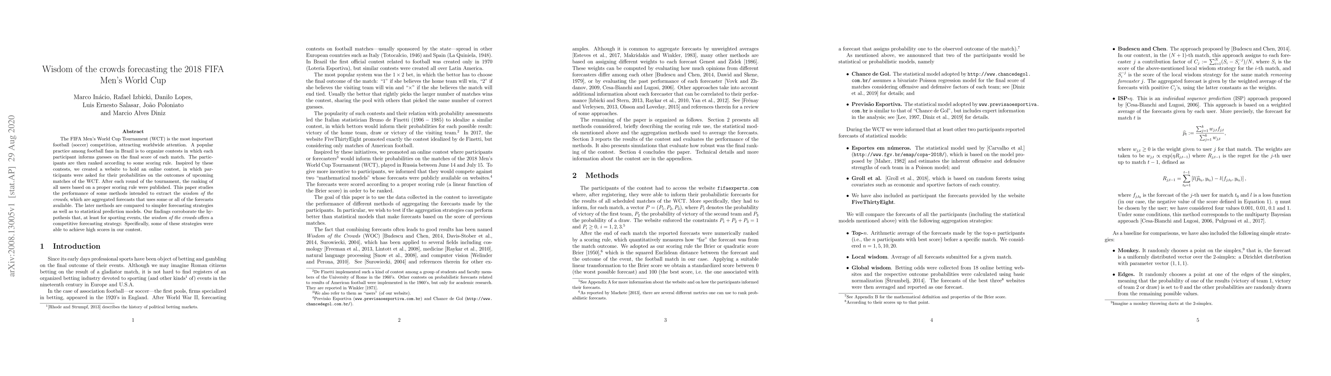 This paper investigates the effectiveness of crowd-sourced forecasting methods for predicting the outcomes of the 2018 FIFA Men's World Cup, finding that aggregated crowd forecasts can be competitive with simpler strategies and statistical models. The study highlights the potential of crowd wisdom in sports event forecasting.