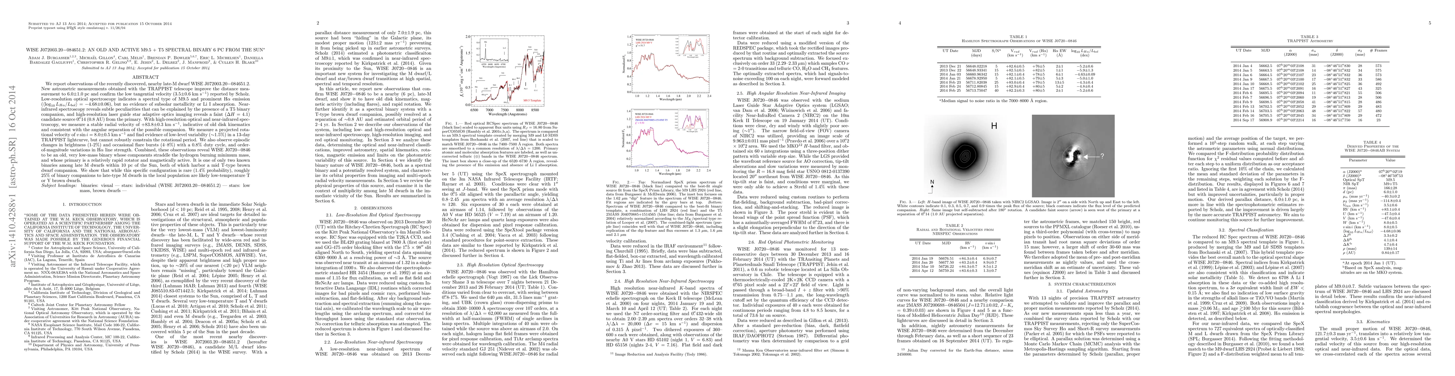 The paper presents WISE J072003.20-084651.2, a nearby old M9.5 + T5 binary system, 6 pc from Earth. It details observations using TRAPPIST, revealing a low-velocity, rapidly rotating, and magnetically active M dwarf primary with a T5 companion. The system exhibits variability in brightness, flare bursts, and Hα line strength, suggesting it's an old binary among the nearest late M dwarfs with a T-type brown dwarf companion.