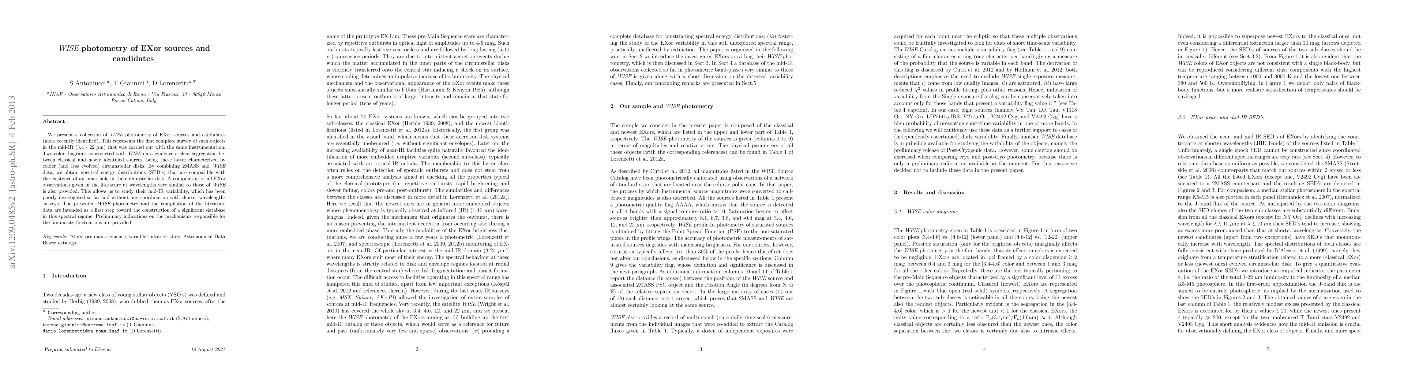 We present a collection of WISE photometry of EXor sources and candidates (more recently identified). This represents the first complete survey of such objects in the mid-IR (3.4 - 22 um) that was carried out with the same instrumentation. Two-color diagrams constructed with WISE data evidence a clear segregation between classical and newly identified sources, being these latter characterized by colder (and less evolved) circumstellar disks. By combining 2MASS and WISE data, we obtain spectral energy distributions (SED's) that are compatible with the existence of an inner hole in the circumstellar disk. A compilation of all EXor observations given in the literature at wavelengths very similar to those of WISE is also provided. This allows us to study their mid-IR variability, which has been poorly investigated so far and without any coordination with shorter wavelengths surveys. The presented it WISE photometry and the compilation of the literature data are intended as a first step toward the construction of a significant database in this spectral regime. Preliminary indications on the mechanisms responsible for the luminosity fluctuations are provided.
