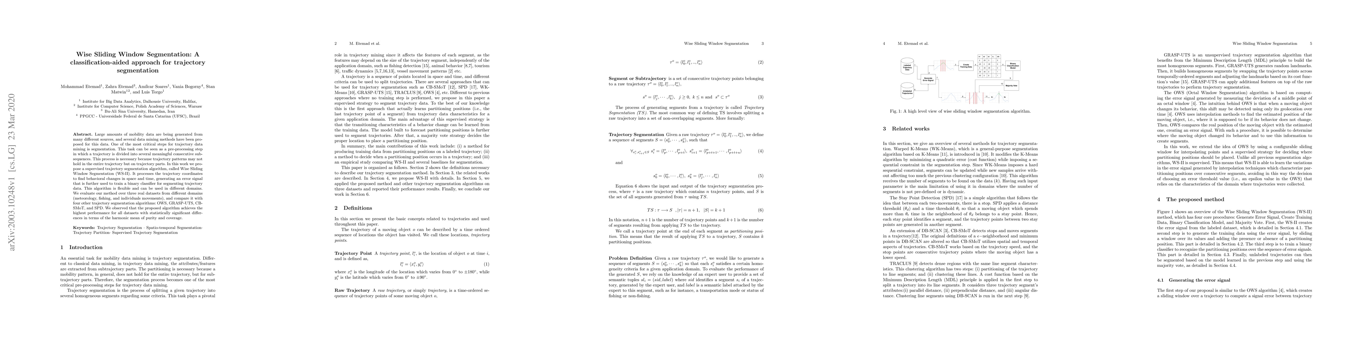 Large amounts of mobility data are being generated from many different sources, and several data mining methods have been proposed for this data. One of the most critical steps for trajectory data mining is segmentation. This task can be seen as a pre-processing step in which a trajectory is divided into several meaningful consecutive sub-sequences. This process is necessary because trajectory patterns may not hold in the entire trajectory but on trajectory parts. In this work, we propose a supervised trajectory segmentation algorithm, called Wise Sliding Window Segmentation (WS-II). It processes the trajectory coordinates to find behavioral changes in space and time, generating an error signal that is further used to train a binary classifier for segmenting trajectory data. This algorithm is flexible and can be used in different domains. We evaluate our method over three real datasets from different domains (meteorology, fishing, and individuals movements), and compare it with four other trajectory segmentation algorithms: OWS, GRASP-UTS, CB-SMoT, and SPD. We observed that the proposed algorithm achieves the highest performance for all datasets with statistically significant differences in terms of the harmonic mean of purity and coverage.