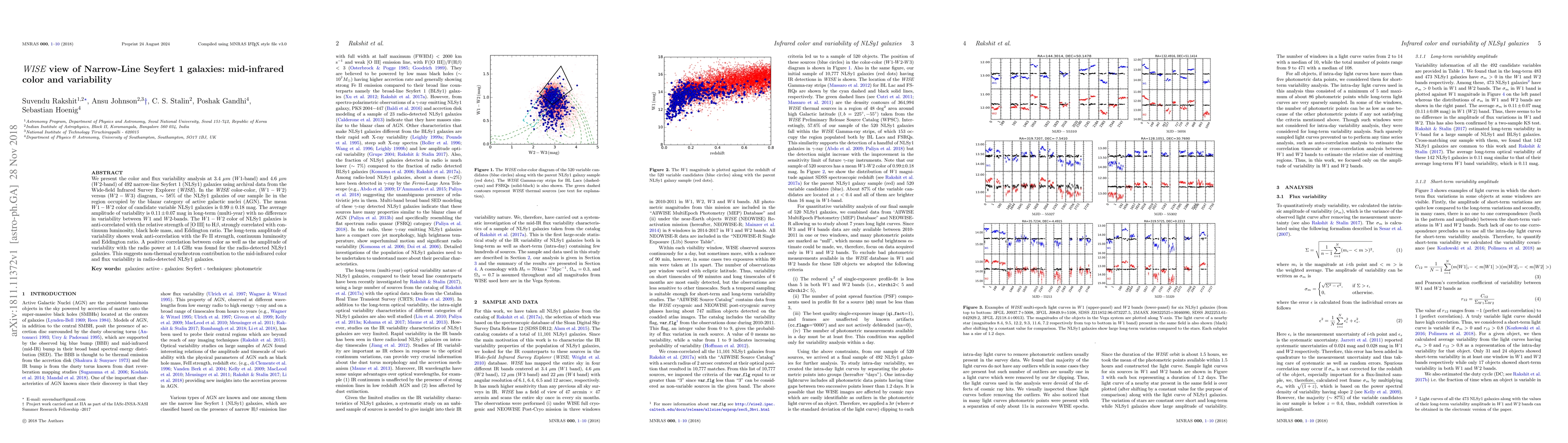 This study analyzes mid-infrared color and variability of 492 Narrow-Line Seyfert 1 galaxies using WISE data, finding that 58% resemble blazars in color-color diagrams. The W1-W2 color correlates with various AGN properties and shows weak anti-correlation with Fe II strength, suggesting non-thermal synchrotron contributions to mid-infrared variability in radio-detected NLSy1 galaxies.