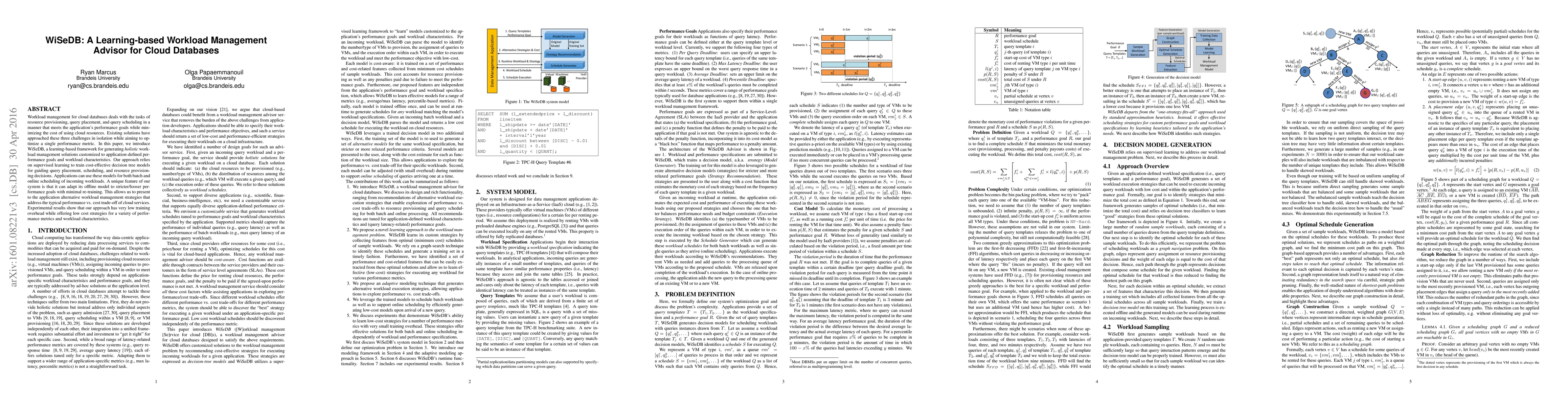 WiSeDB is a learning-based framework that holistically manages workload in cloud databases by integrating resource provisioning, query placement, and scheduling. It uses supervised learning to create cost-effective decision tree models that adapt to varying performance goals and workload characteristics, offering low-cost strategies with minimal re-training.