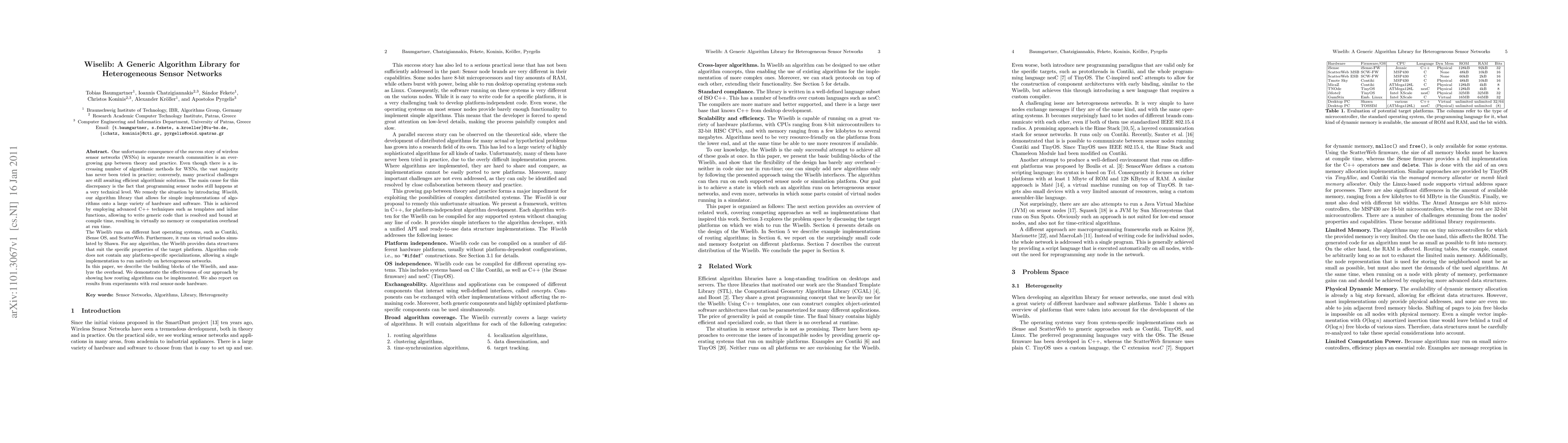 Wiselib is a generic C++ algorithm library designed to bridge the gap between theoretical and practical applications in wireless sensor networks (WSNs) by enabling simple, efficient implementations across diverse hardware and software platforms. The library employs advanced C++ techniques to provide platform-independent code with minimal runtime overhead, demonstrating effectiveness through routing algorithm implementations and real-world sensor-node experiments.