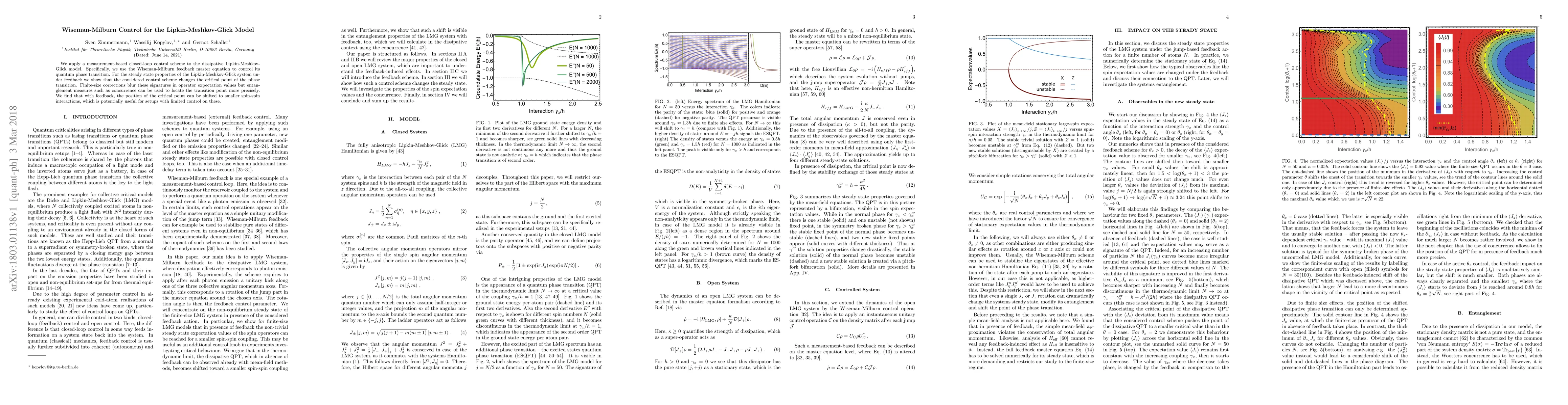 This paper applies Wiseman-Milburn control to the Lipkin-Meshkov-Glick model to manipulate its quantum phase transition, shifting the critical point to smaller spin-spin interactions. Entanglement measures like concurrence provide a more precise method for identifying the transition point despite finite-size corrections.