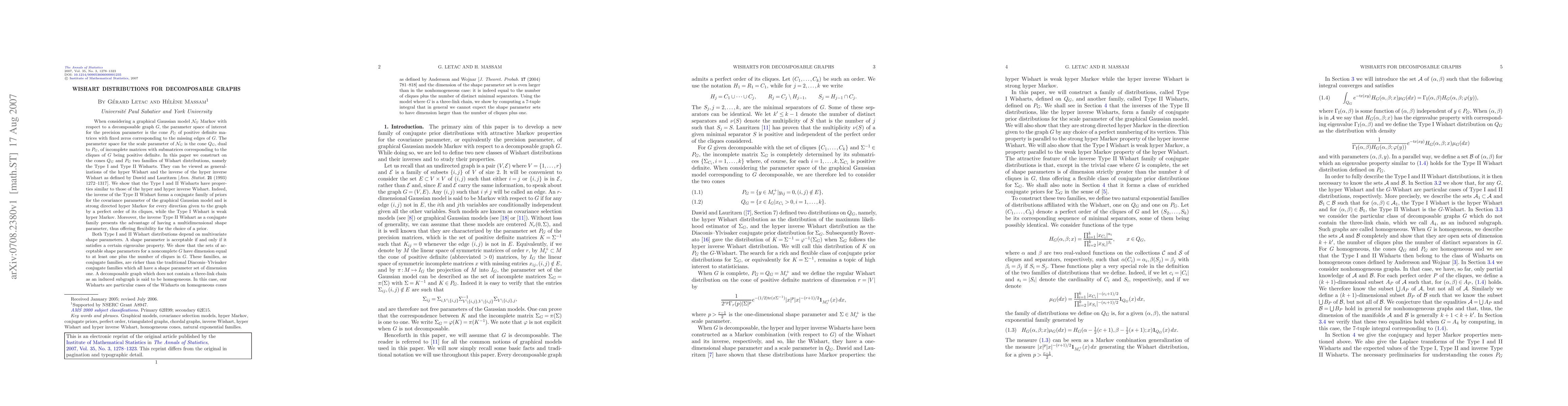 When considering a graphical Gaussian model ${\mathcal{N}}_G$ Markov with respect to a decomposable graph $G$, the parameter space of interest for the precision parameter is the cone $P_G$ of positive definite matrices with fixed zeros corresponding to the missing edges of $G$. The parameter space for the scale parameter of ${\mathcal{N}}_G$ is the cone $Q_G$, dual to $P_G$, of incomplete matrices with submatrices corresponding to the cliques of $G$ being positive definite. In this paper we construct on the cones $Q_G$ and $P_G$ two families of Wishart distributions, namely the Type I and Type II Wisharts. They can be viewed as generalizations of the hyper Wishart and the inverse of the hyper inverse Wishart as defined by Dawid and Lauritzen [Ann. Statist. 21 (1993) 1272--1317]. We show that the Type I and II Wisharts have properties similar to those of the hyper and hyper inverse Wishart. Indeed, the inverse of the Type II Wishart forms a conjugate family of priors for the covariance parameter of the graphical Gaussian model and is strong directed hyper Markov for every direction given to the graph by a perfect order of its cliques, while the Type I Wishart is weak hyper Markov. Moreover, the inverse Type II Wishart as a conjugate family presents the advantage of having a multidimensional shape parameter, thus offering flexibility for the choice of a prior.