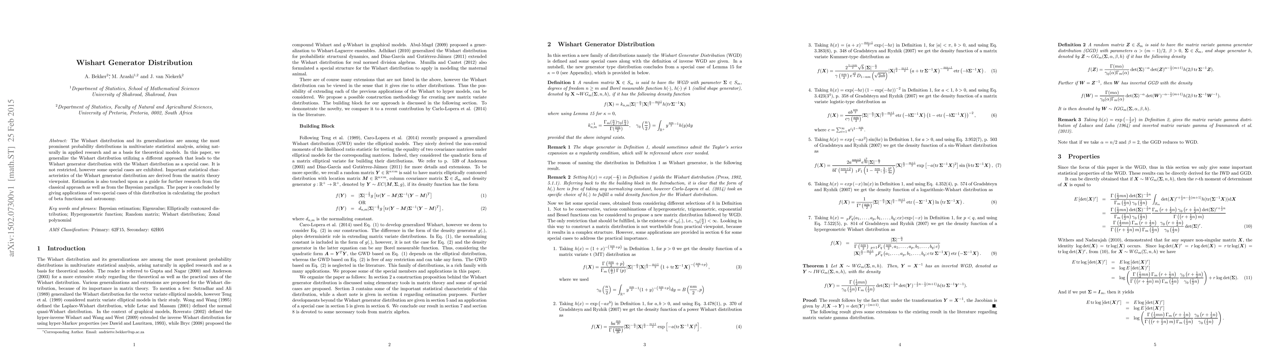 This paper generalizes the Wishart distribution to the Wishart generator distribution, deriving its statistical characteristics from matrix theory. It also explores estimation methods from both classical and Bayesian perspectives and applies two special cases to calculate the product of beta functions and in astronomy.