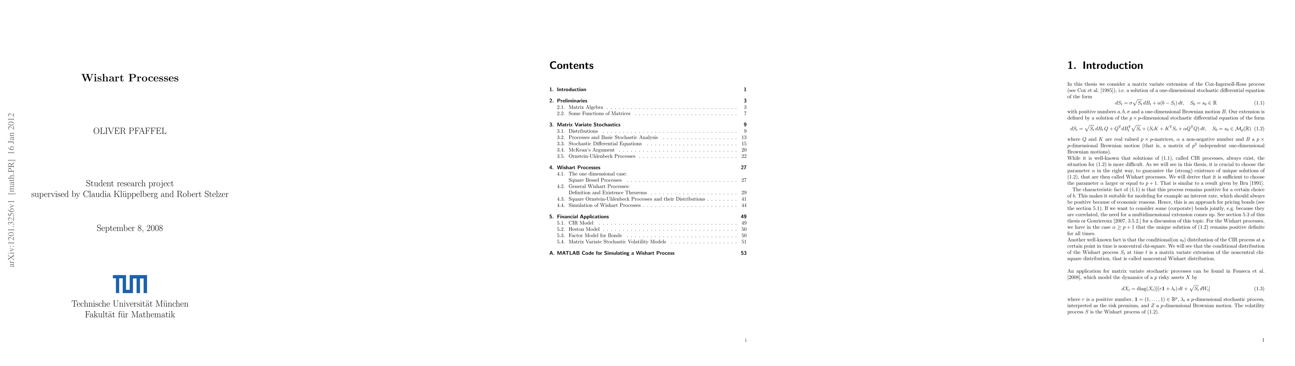 This paper reviews Wishart processes, matrix-valued continuous time stochastic processes with marginal Wishart distributions, and discusses their existence and uniqueness as solutions to stochastic differential equations. It also explores their applications in modeling interest rates and covariance matrices in stochastic volatility models.