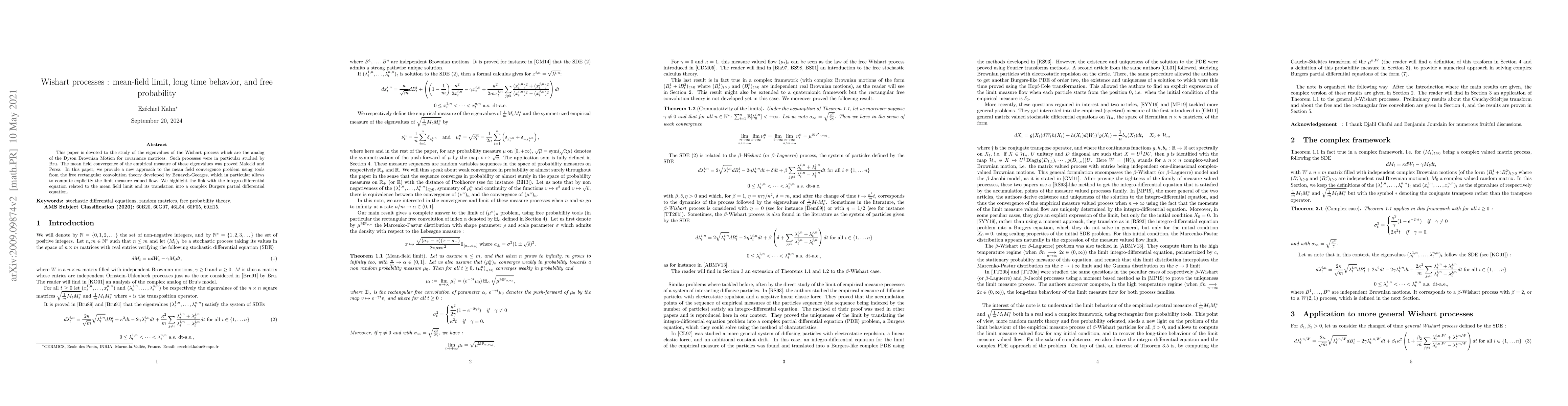 This paper studies the Wishart process, a stochastic process for covariance matrices, and its mean-field limit using free rectangular convolution theory. It provides a new approach to computing the limit measure-valued flow and highlights connections to complex Burgers partial differential equations.