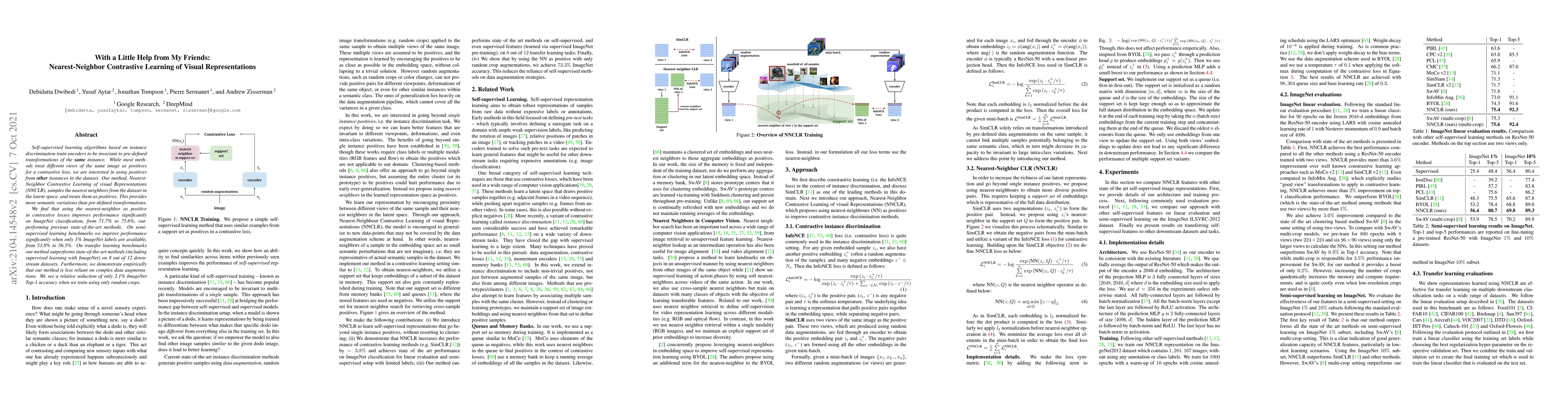 NNCLR employs nearest-neighbors as positives in contrastive learning to enhance visual representation training, achieving superior performance on ImageNet classification and semi-supervised learning benchmarks compared to previous methods.