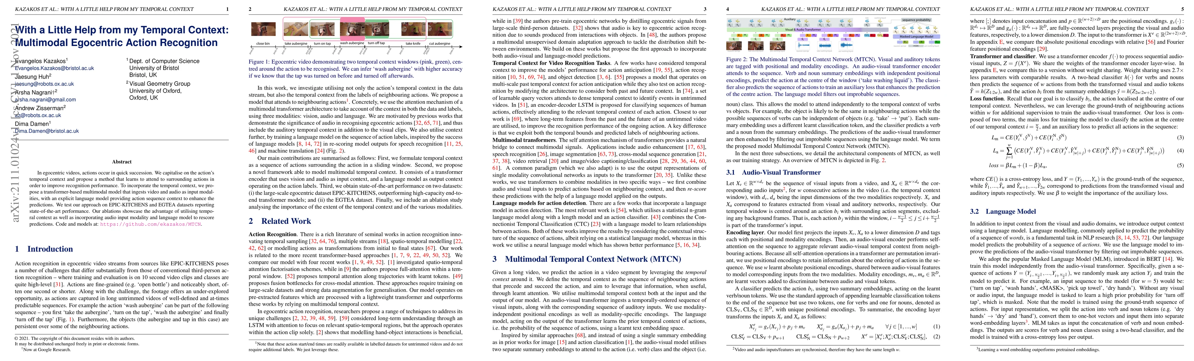 This paper proposes a transformer-based multimodal model for egocentric action recognition that leverages temporal context and audio input to improve performance. The method achieves state-of-the-art results on EPIC-KITCHENS and EGTEA datasets, demonstrating the benefits of using surrounding actions and language model context for prediction enhancement.