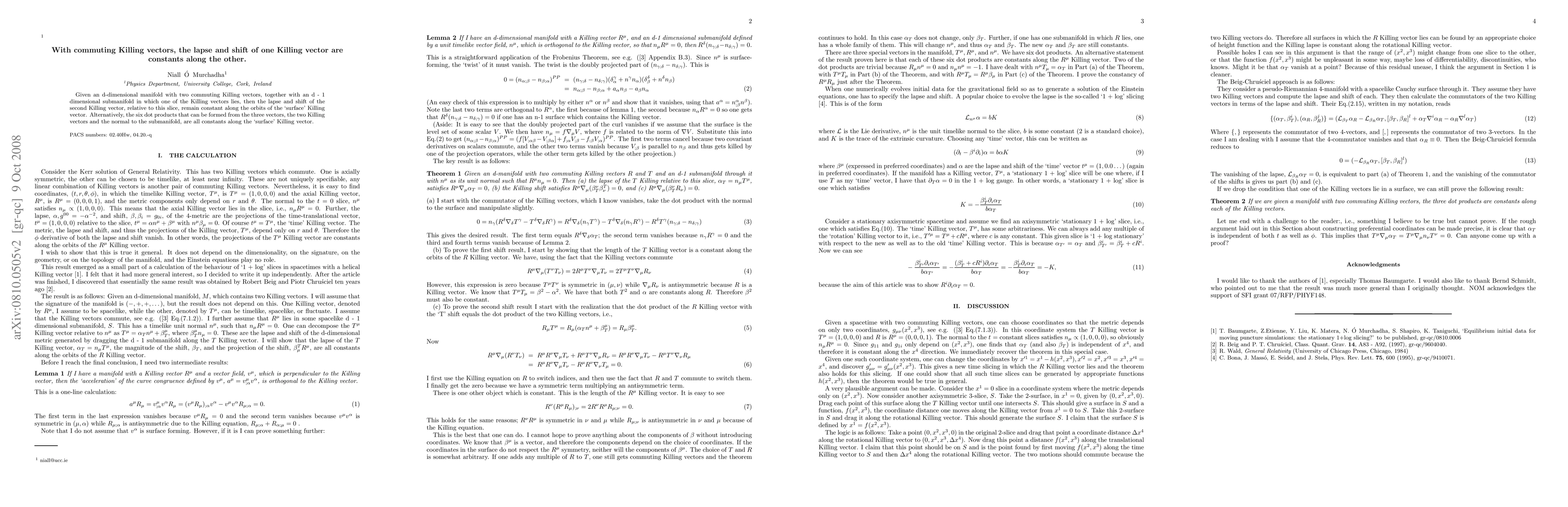 Given an d-dimensional manifold with two commuting Killing vectors, together with an d - 1 dimensional submanifold in which one of the Killing vectors lies, then the lapse and shift of the second Killing vector, relative to this slice, remain constant along the orbits of the `surface' Killing vector. Alternatively, the six dot products that can be formed from the three vectors, the two Killing vectors and the normal to the submanifold, are all constants along the `surface' Killing vector.