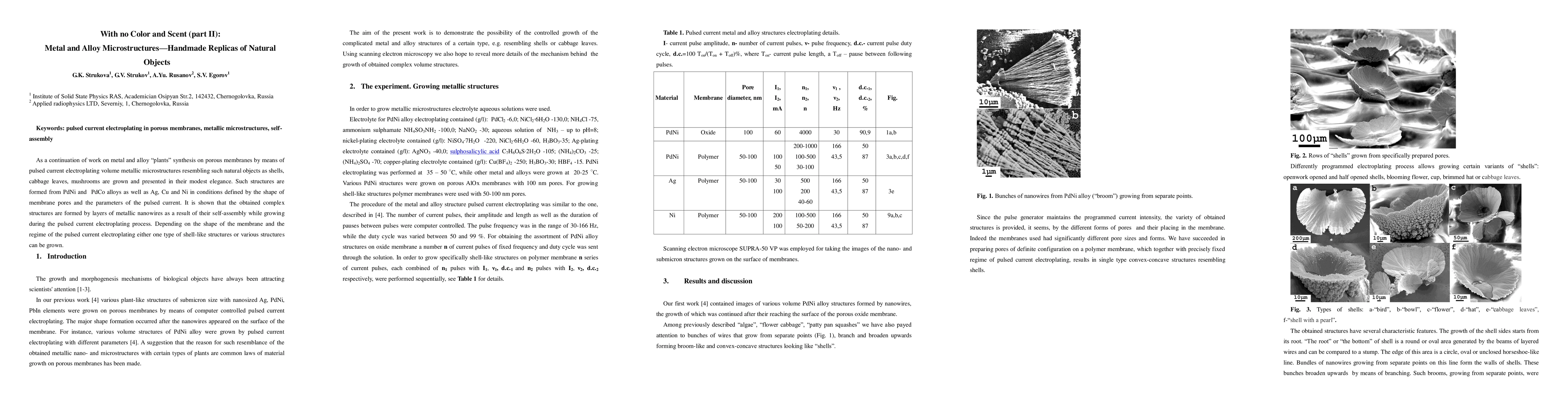 This paper continues the study of metal and alloy microstructures synthesized on porous membranes using pulsed current electroplating, creating elegant replicas of natural objects like shells and leaves. The paper demonstrates that PdNi, PdCo alloys, and other metals form complex, layered metallic nanowire structures, with the final shape and type of structure dependent on the membrane's pore shape and the electroplating parameters.