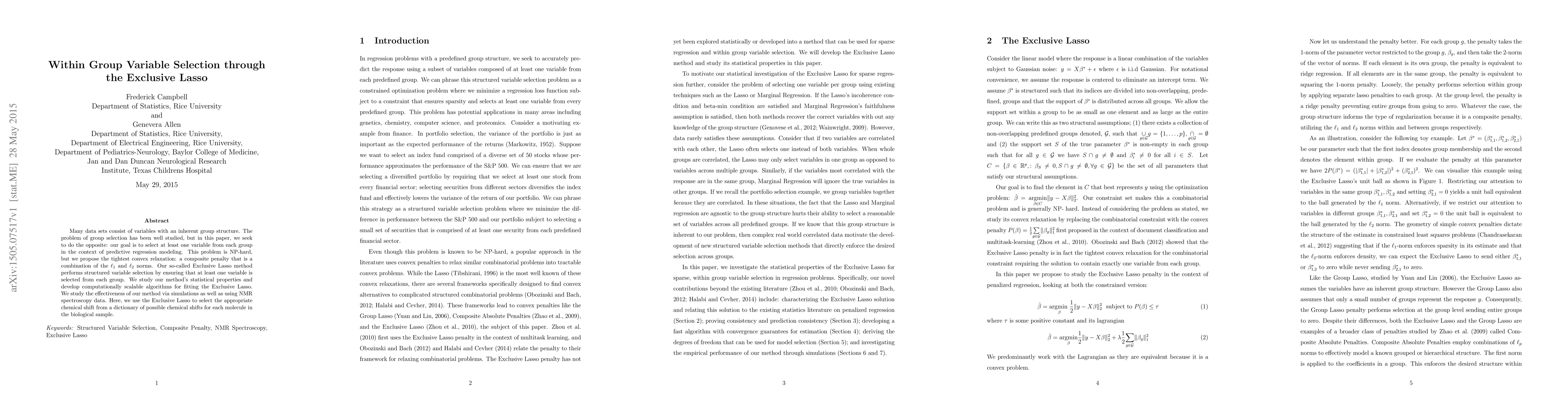 The paper proposes the Exclusive Lasso method for structured variable selection in predictive regression modeling, ensuring at least one variable is selected from each group. It studies the method's statistical properties and develops scalable algorithms for fitting the Exclusive Lasso, using simulations and NMR spectroscopy data for evaluation.