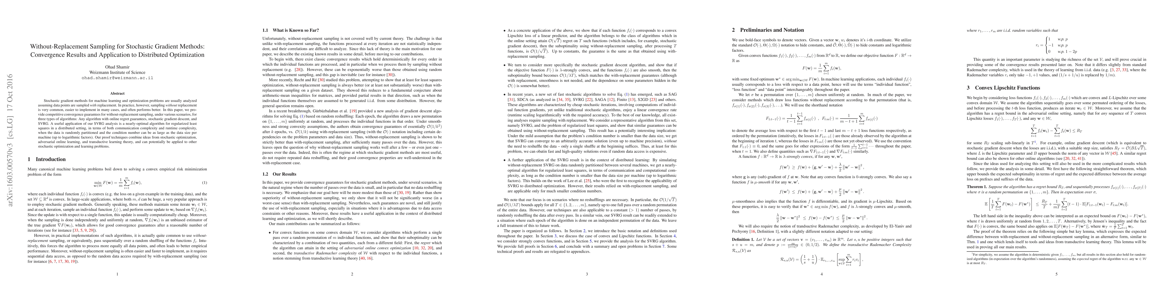This paper provides convergence guarantees for stochastic gradient methods under without-replacement sampling, demonstrating competitive performance compared to with-replacement sampling. It applies these results to develop a nearly-optimal distributed optimization algorithm for regularized least squares, achieving optimal communication and runtime complexity.