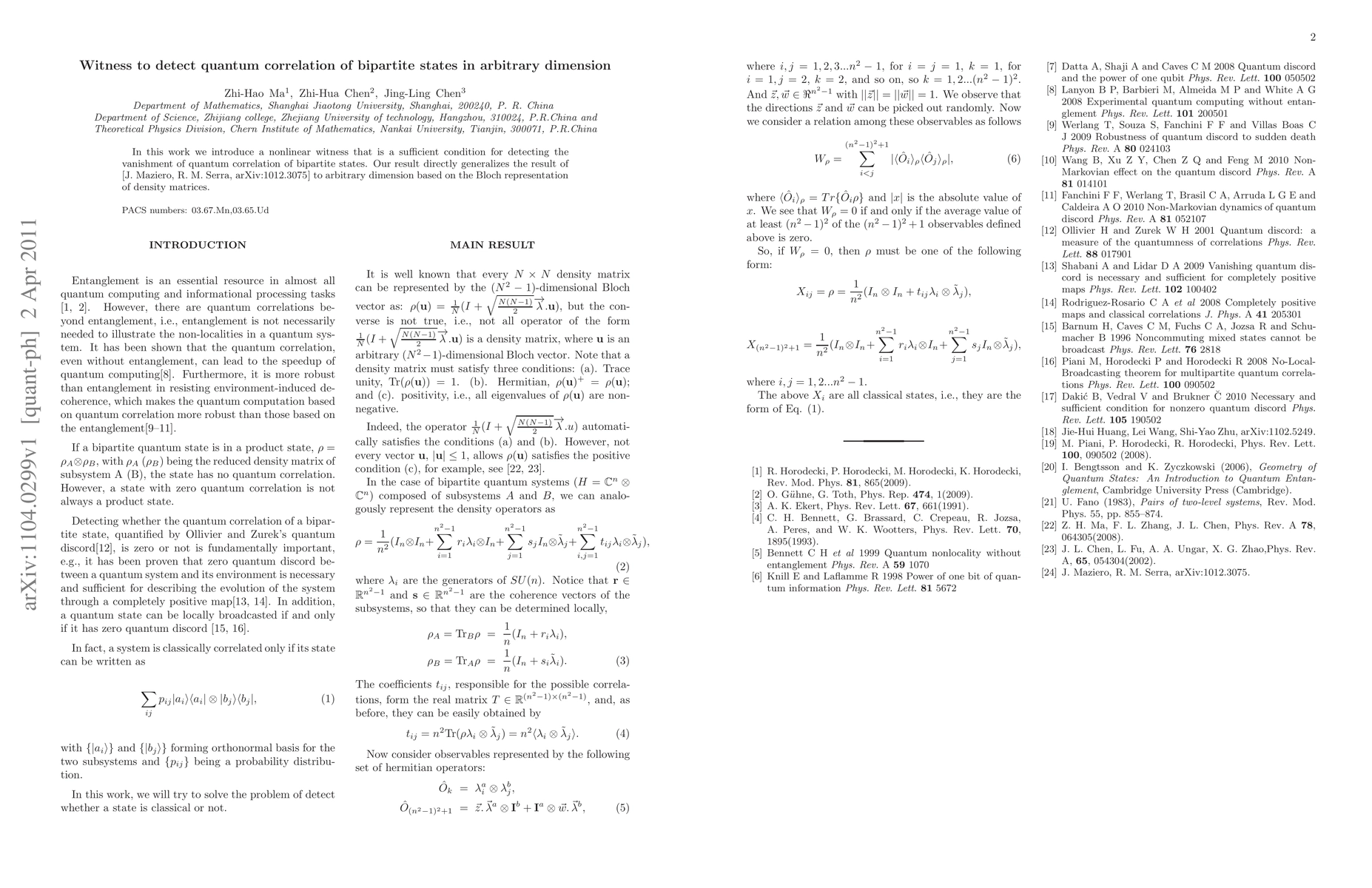 In this work we introduce a nonlinear witness that is a sufficient condition for detecting the vanishment of quantum correlation of bipartite states. Our result directly generalizes the result of [J. Maziero, R. M. Serra, arXiv:1012.3075] to arbitrary dimension based on the Bloch representation of density matrices.