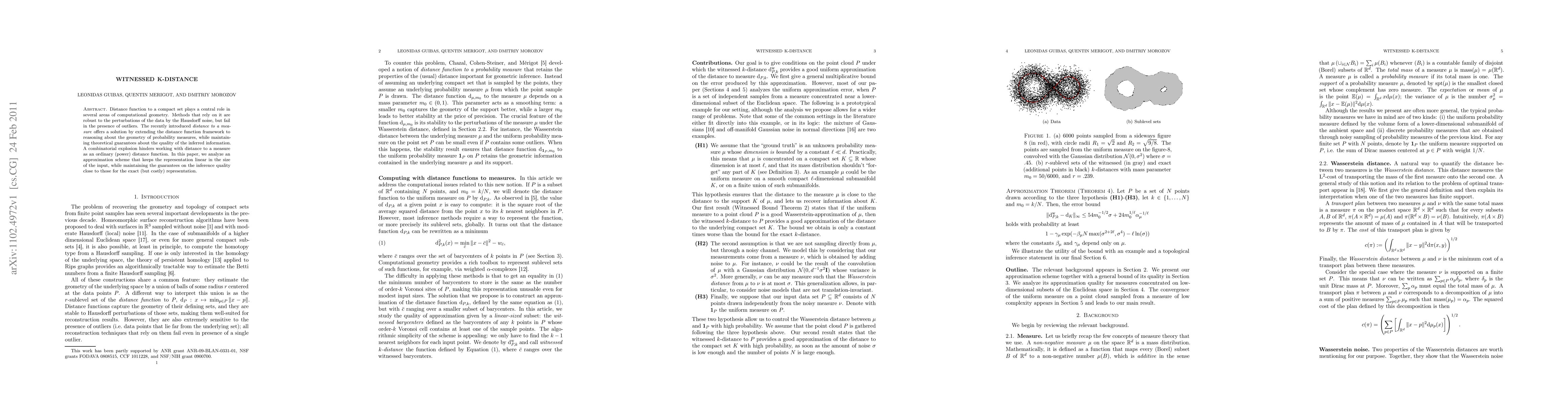 Distance function to a compact set plays a central role in several areas of computational geometry. Methods that rely on it are robust to the perturbations of the data by the Hausdorff noise, but fail in the presence of outliers. The recently introduced distance to a measure offers a solution by extending the distance function framework to reasoning about the geometry of probability measures, while maintaining theoretical guarantees about the quality of the inferred information. A combinatorial explosion hinders working with distance to a measure as an ordinary (power) distance function. In this paper, we analyze an approximation scheme that keeps the representation linear in the size of the input, while maintaining the guarantees on the inference quality close to those for the exact (but costly) representation.