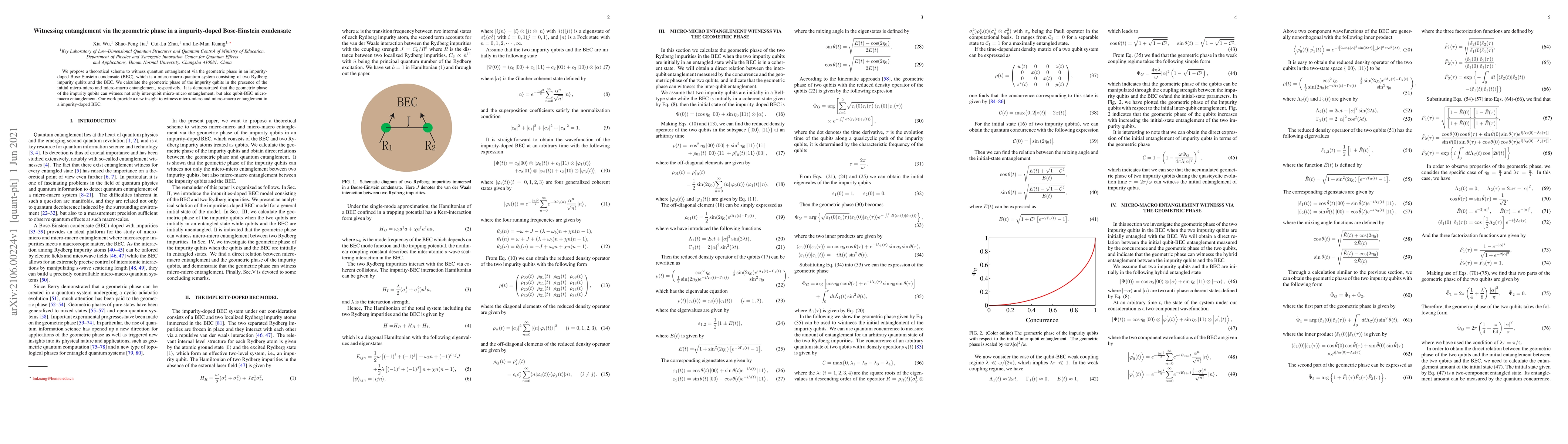This paper proposes a theoretical method to detect quantum entanglement in an impurity-doped Bose-Einstein condensate using the geometric phase. The study shows that the geometric phase of impurity qubits can reveal both micro-micro and micro-macro entanglement, offering new insights into entanglement in such quantum systems.
