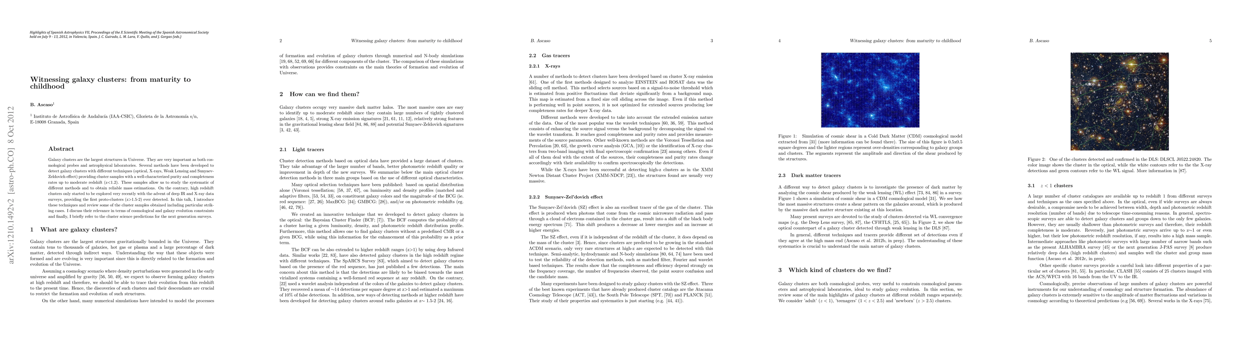 Galaxy clusters are the largest structures in Universe. They are very important as both cosmological probes and astrophysical laboratories. Several methods have been developed to detect galaxy clusters with different techniques (optical, X-rays, Weak Lensing and Sunyaev-Zeldovich effect) providing cluster samples with a well-characterized purity and completeness rates up to moderate redshift (z$<$1.2). These samples allow us to study the systematic of different methods and to obtain reliable mass estimations. On the contrary, high redshift clusters only started to be explored very recently with the advent of deep IR and X-ray data surveys, providing the first proto-clusters (z$>$1.5-2) ever detected. In this talk, I introduce these techniques and review some of the cluster samples obtained including particular striking cases. I discuss their relevance in terms of cosmological and galaxy evolution constraints and finally, I briefly refer to the cluster science predictions for the next generation surveys.