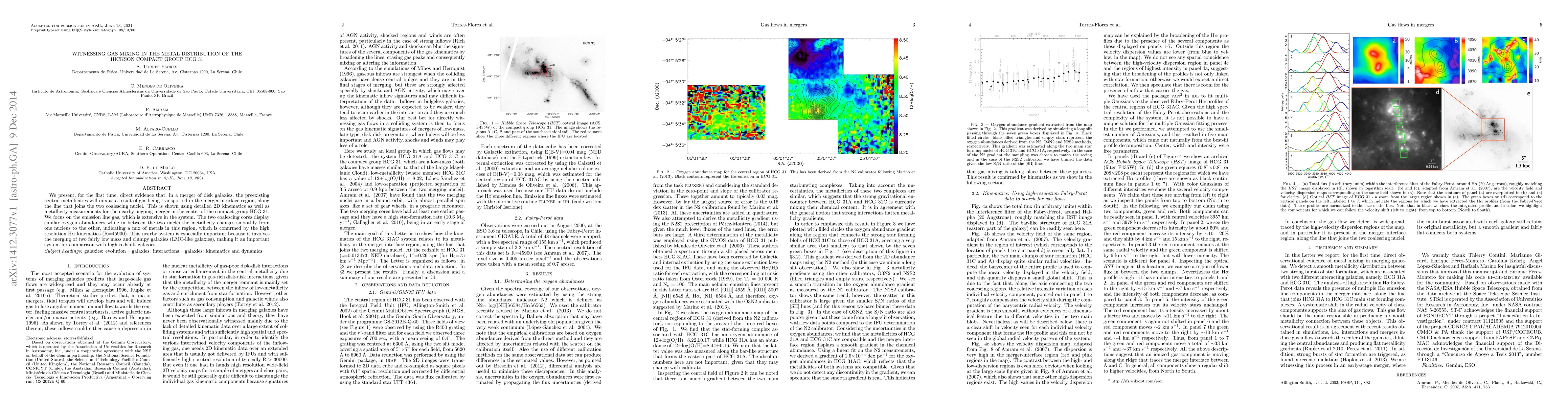 We present, for the first time, direct evidence that, in a merger of disk galaxies, the preexisting central metallicities will mix as a result of gas being transported in the merger interface region, along the line that joins the two coalescing nuclei. This is shown using detailed 2D kinematics as well as metallicity measurements for the nearby ongoing merger in the center of the compact group HCG 31. We focus on the emission line gas, which is extensive in the system. The two coalescing cores display similar oxygen abundances while in between the two nuclei the metallicity changes smoothly from one nucleus to the other, indicating a mix of metals in this region, which is confirmed by the high resolution H$\alpha$ kinematics (R=45900). This nearby system is especially important because it involves the merging of two fairly low mass and clumpy galaxies (LMC-like galaxies), making it an important system for comparison with high redshift galaxies.