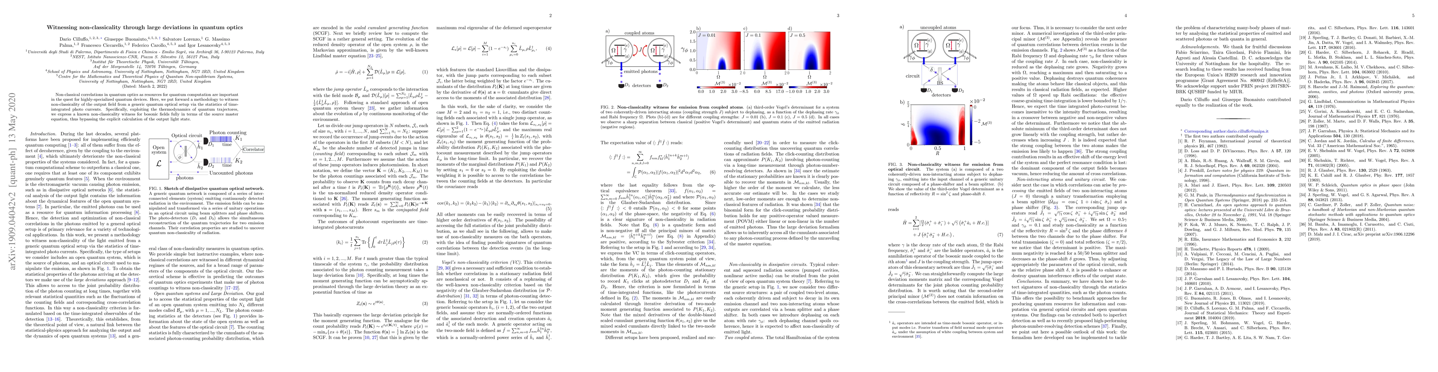 Non-classical correlations in quantum optics as resources for quantum computation are important in the quest for highly-specialized quantum devices. The standard way to investigate such effects relies on either the characterization of the inherent features of sources and circuits or the study of the output radiation of a given optical setup. The latter approach demands an extensive description of the output fields, but often overlooks the dynamics of the sources. Conversely, the former discards most of the information about the single trajectories, which are observed in experimental measurements. In this work we provide a natural link between the two frameworks by exploiting the thermodynamics of quantum trajectories. This procedure enables investigation of the quantum properties of the photon fields from a generic source via the analysis of the fluctuations and correlations of time-integrated quantities associated with the photon counting of the emitted light.