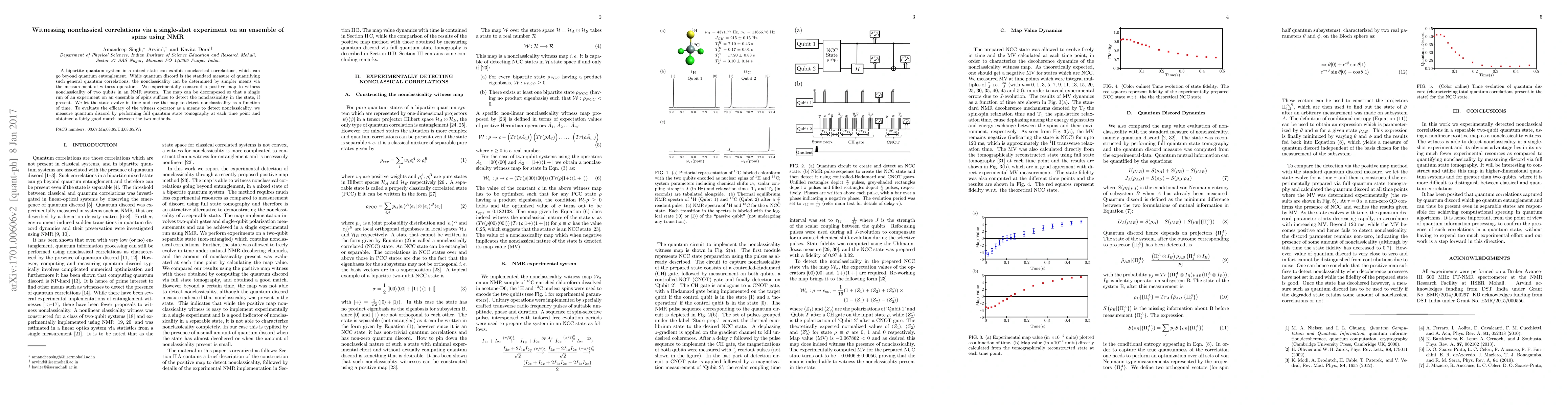 This paper demonstrates a single-shot experiment using NMR to witness nonclassical correlations in a bipartite mixed quantum state, employing a positive map decomposed to require only one run on an ensemble of spins. The study compares the efficacy of the witness operator method with quantum discord measurements obtained through full quantum state tomography.