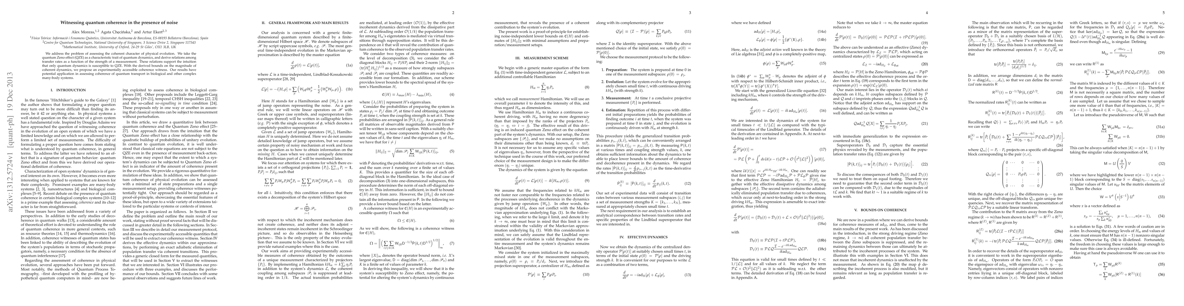 This paper explores the quantum Zeno effect to assess quantum coherence amidst noise, proposing a coherence witness based on derived relations between transfer rates. The findings could aid in evaluating coherence in quantum transport processes in complex biological and many-body systems.