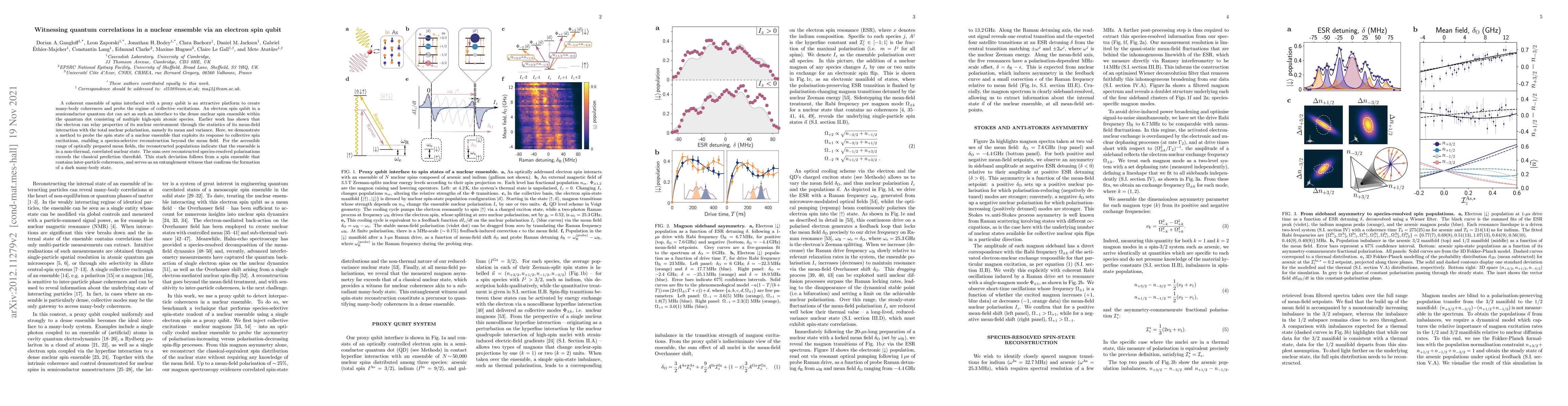 A coherent ensemble of spins interfaced with a proxy qubit is an attractive platform to create many-body coherences and probe the regime of collective excitations. An electron spin qubit in a semiconductor quantum dot can act as such an interface to the dense nuclear spin ensemble within the quantum dot consisting of multiple high-spin atomic species. Earlier work has shown that the electron can relay properties of its nuclear environment through the statistics of its mean-field interaction with the total nuclear polarisation, namely its mean and variance. Here, we demonstrate a method to probe the spin state of a nuclear ensemble that exploits its response to collective spin excitations, enabling a species-selective reconstruction beyond the mean field. For the accessible range of optically prepared mean fields, the reconstructed populations indicate that the ensemble is in a non-thermal, correlated nuclear state. The sum over reconstructed species-resolved polarisations exceeds the classical prediction threefold. This stark deviation follows from a spin ensemble that contains inter-particle coherences, and serves as an entanglement witness that confirms the formation of a dark many-body state.