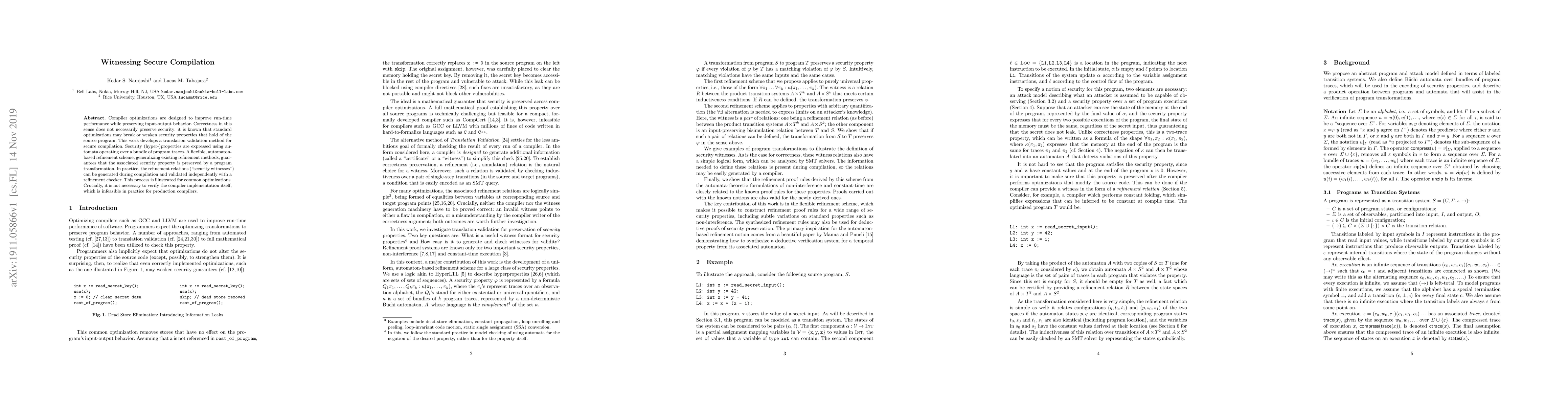 This paper proposes a method for validating secure compilation by generating "security witnesses" that ensure security properties are preserved during optimizations, without requiring verification of the compiler itself. The approach uses automata to express and check security (hyper-)properties, and demonstrates its application to common optimizations.