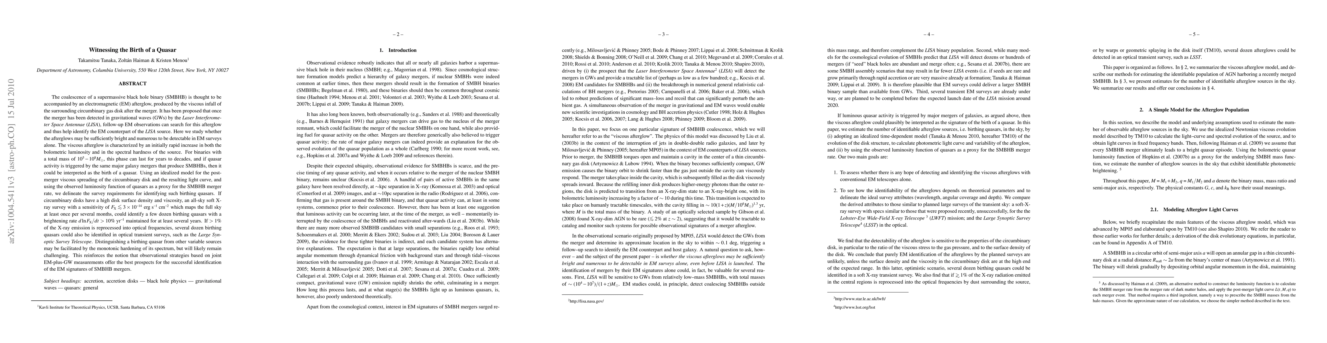The coalescence of a supermassive black hole binary (SMBHB) is thought to be accompanied by an electromagnetic (EM) afterglow, produced by the viscous infall of the surrounding circumbinary gas disk after the merger. It has been proposed that once the merger has been detected in gravitational waves (GWs) by LISA, follow-up EM searches for this afterglow can help identify the EM counterpart of the LISA source. Here we study whether the afterglows may be sufficiently bright and numerous to be detectable in EM surveys alone. The viscous afterglow, which lasts for years to decades for SMBHBs in LISA's sensitivity window, is characterized by rapid increases in both the bolometric luminosity and in the spectral hardness of the source. If quasar activity is triggered by the same major galaxy mergers that produce SMBHBs, then the afterglow could be interpreted as a signature of the birth of a quasar. Using an idealized model for the post-merger viscous spreading of the circumbinary disk and the resulting light curve, and using the observed luminosity function of quasars as a proxy for the SMBHB merger rate, we delineate the survey requirements for identifying such birthing quasars. If circumbinary disks have a high disk surface density and viscosity, an all-sky soft X-ray survey with a sensitivity of ~<3x10^-14 erg s^-1 cm^-2 and a time resolution of ~months could identify dozens of birthing quasars with sustained brightening rates of >10%/yr. If >1% of the X-ray emission is reprocessed into optical frequencies, birthing quasars could also be identified in optical transient surveys such as the LSST. Distinguishing a birthing quasar from other variable sources may be facilitated by the monotonic hardening of its spectrum, but will likely remain challenging. This reinforces the notion that joint EM-plus-GW observations offer the best prospects for identifying the EM signatures of SMBHB mergers.