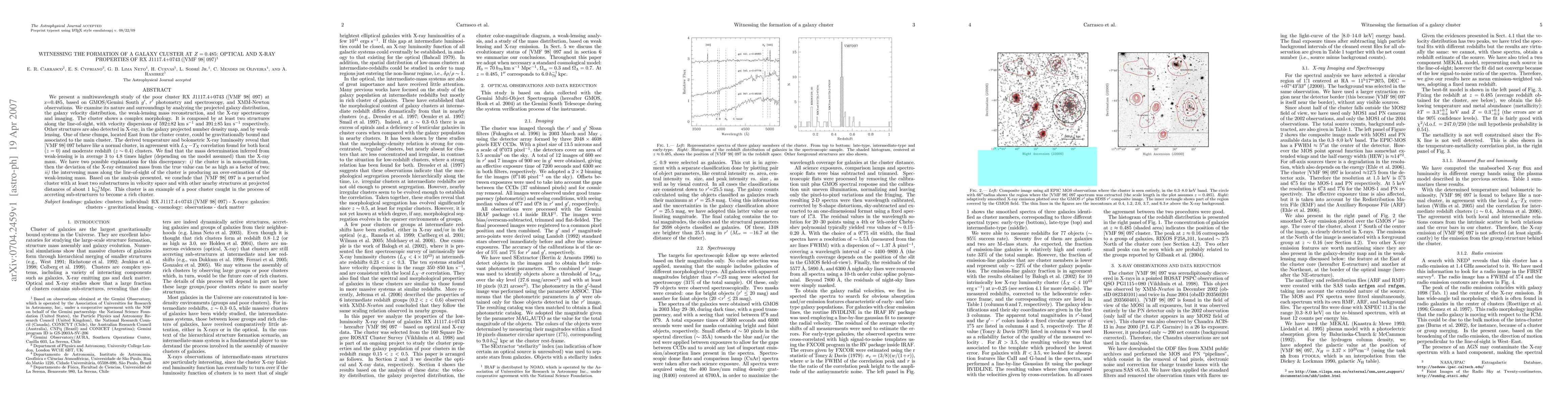 We present a multiwavelength study of the poor cluster RX J1117.4+0743 ([VMF 98] 097) at z=0.485, based on GMOS/Gemini South g', r' photometry and spectroscopy, and XMM-Newton observations. We examine its nature and surroundings by analyzing the projected galaxy distribution, the galaxy velocity distribution, the weak-lensing mass reconstruction, and the X-ray spectroscopy and imaging. The cluster shows a complex morphology. It is composed by at least two structures along the line-of-sight, with velocity dispersions of 592+-82 km s^-1 and 391+-85 km s^-1 respectively. Other structures are also detected in X-ray, in the galaxy projected number density map, and by weak-lensing. One of these clumps, could be gravitationally bound and associated to the main cluster. The derived temperature and bolometric X-ray luminosity reveal that [VMF 98] 097 behave like a normal cluster, in agreement with Lx-Tx correlation found for both local (z=0) and moderate redshift (z~0.4) clusters. We find that the mass determination inferred from weak-lensing is in average 3 to 4.8 times higher (depending on the model assumed) than the X-ray mass. We have two possible explanations for this discrepancy: i) the cluster is in non-equilibrium, then the deviation of the X-ray estimated mass from the true value can be as high as a factor of two; ii) the intervening mass along the line-of-sight of the cluster is producing an over-estimation of the weak-lensing mass. Based on the analysis presented, we conclude that [VMF 98] 097 is a perturbed cluster with at least two substructures in velocity space and with other nearby structures at projected distances of about 1 h^-1 Mpc. This cluster is an example of a poor cluster caught in the process of accreting sub-structures to become a rich cluster.