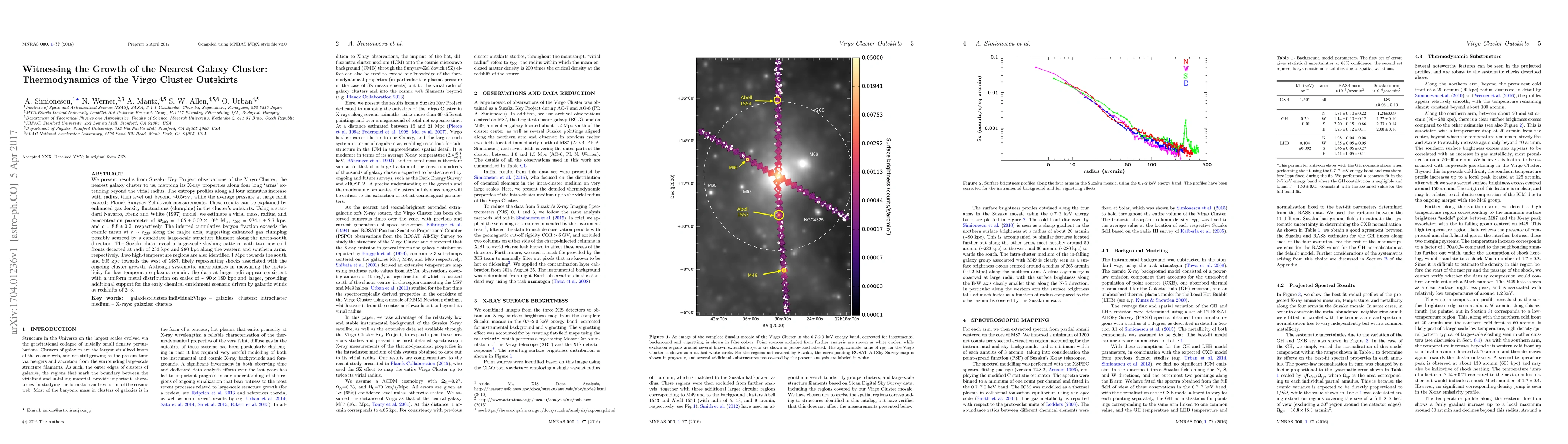 We present results from Suzaku Key Project observations of the Virgo Cluster, the nearest galaxy cluster to us, mapping its X-ray properties along four long `arms' extending beyond the virial radius. The entropy profiles along all four azimuths increase with radius, then level out beyond $0.5r_{200}$, while the average pressure at large radii exceeds Planck Sunyaev-Zel'dovich measurements. These results can be explained by enhanced gas density fluctuations (clumping) in the cluster's outskirts. Using a standard Navarro, Frenk and White (1997) model, we estimate a virial mass, radius, and concentration parameter of $M_{200}=1.05\pm0.02\times10^{14}$ M$_\odot$, $r_{200}=974.1\pm5.7$ kpc, and $c = 8.8 \pm0.2$, respectively. The inferred cumulative baryon fraction exceeds the cosmic mean at $r\sim r_{200}$ along the major axis, suggesting enhanced gas clumping possibly sourced by a candidate large-scale structure filament along the north-south direction. The Suzaku data reveal a large-scale sloshing pattern, with two new cold fronts detected at radii of 233 kpc and 280 kpc along the western and southern arms, respectively. Two high-temperature regions are also identified 1 Mpc towards the south and 605 kpc towards the west of M87, likely representing shocks associated with the ongoing cluster growth. Although systematic uncertainties in measuring the metallicity for low temperature plasma remain, the data at large radii appear consistent with a uniform metal distribution on scales of $\sim 90\times180$ kpc and larger, providing additional support for the early chemical enrichment scenario driven by galactic winds at redshifts of 2-3.