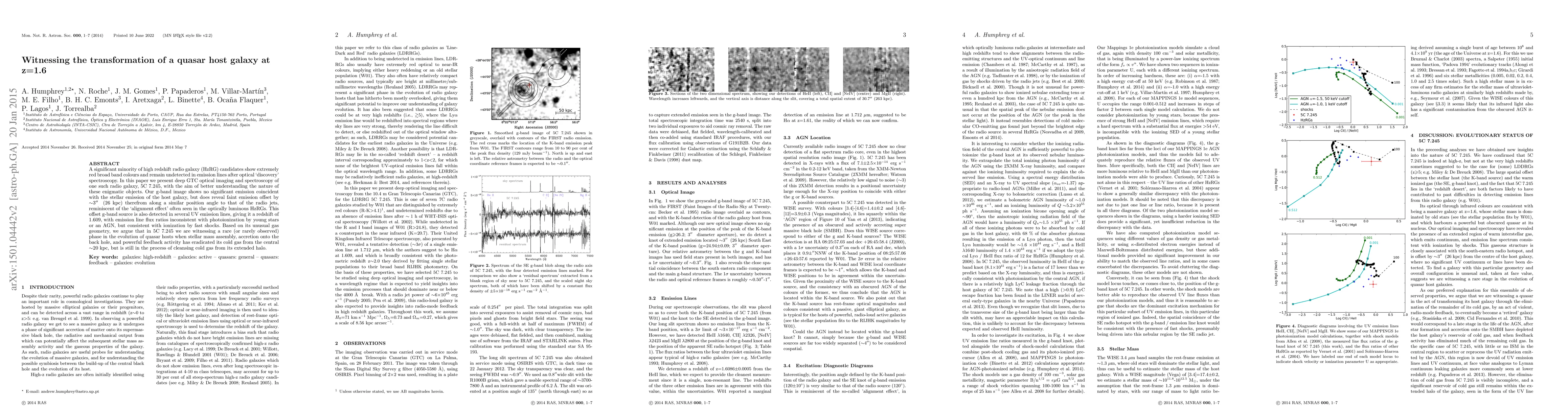 A significant minority of high redshift radio galaxy (HzRG) candidates show extremely red broad band colours and remain undetected in emission lines after optical `discovery' spectroscopy. In this paper we present deep GTC optical imaging and spectroscopy of one such radio galaxy, 5C 7.245, with the aim of better understanding the nature of these enigmatic objects. Our g-band image shows no significant emission coincident with the stellar emission of the host galaxy, but does reveal faint emission offset by ~3" (26 kpc) therefrom along a similar position angle to that of the radio jets, reminiscent of the `alignment effect' often seen in the optically luminous HzRGs. This offset g-band source is also detected in several UV emission lines, giving it a redshift of 1.609, with emission line flux ratios inconsistent with photoionization by young stars or an AGN, but consistent with ionization by fast shocks. Based on its unusual gas geometry, we argue that in 5C 7.245 we are witnessing a rare (or rarely observed) phase in the evolution of quasar hosts when stellar mass assembly, accretion onto the back hole, and powerful feedback activity has eradicated its cold gas from the central ~20 kpc, but is still in the process of cleansing cold gas from its extended halo.