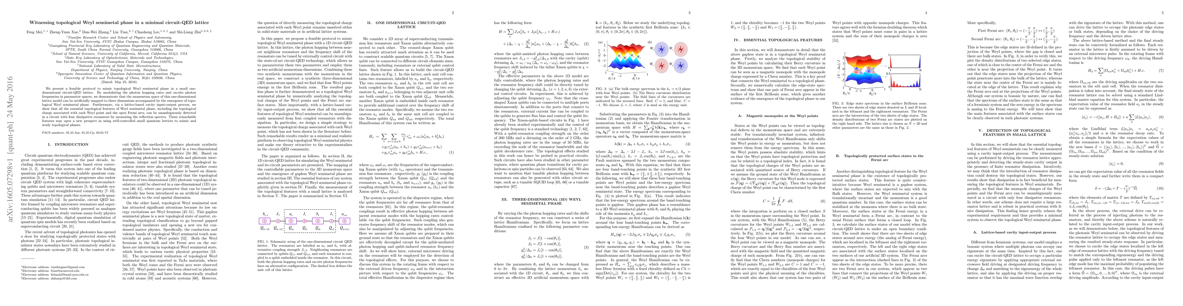We present a feasible protocol to mimic topological Weyl semimetal phase in a small one-dimensional circuit-QED lattice. By modulating the photon hopping rates and on-site photon frequencies in parametric spaces, we demonstrate that the momentum space of this one-dimensional lattice model can be artificially mapped to three dimensions accompanied by the emergence of topological Weyl semimetal phase. Furthermore, via a lattice-based cavity input-output process, we show that all the essential topological features of Weyl semimetal phase, including the topological charge associated with each Weyl point and the open Fermi arcs, can be unambiguously detected in a circuit with four dissipative resonators by measuring the reflection spectra. These remarkable features may open a new prospect in using well-controlled small quantum lattices to mimic and study topological phases.