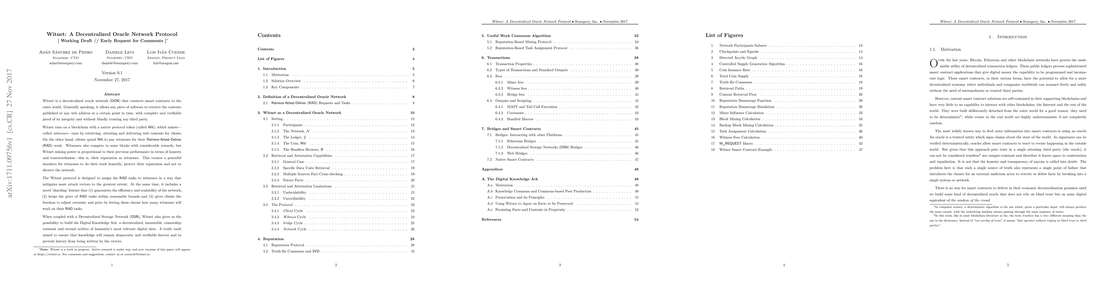 Witnet is a decentralized oracle network (DON) that connects smart contracts to the outer world. Generally speaking, it allows any piece of software to retrieve the contents published at any web address at a certain point in time, with complete and verifiable proof of its integrity and without blindly trusting any third party. Witnet runs on a blockchain with a native protocol token (called Wit), which miners-called witnesses-earn by retrieving, attesting and delivering web contents for clients. On the other hand, clients spend Wit to pay witnesses for their Retrieve-Attest-Deliver (RAD) work. Witnesses also compete to mine blocks with considerable rewards, but Witnet mining power is proportional to their previous performance in terms of honesty and trustworthiness-this is, their reputation as witnesses. This creates a powerful incentive for witnesses to do their work honestly, protect their reputation and not to deceive the network. The Witnet protocol is designed to assign the RAD tasks to witnesses in a way that mitigates most attack vectors to the greatest extent. At the same time, it includes a novel 'sharding' feature that (1) guarantees the efficiency and scalability of the network, (2) keeps the price of RAD tasks within reasonable bounds and (3) gives clients the freedom to adjust certainty and price by letting them choose how many witnesses will work on their RAD tasks. When coupled with a Decentralized Storage Network (DSN), Witnet also gives us the possibility to build the Digital Knowledge Ark: a decentralized, immutable, censorship-resistant and eternal archive of humanity's most relevant digital data. A truth vault aimed to ensure that knowledge will remain democratic and verifiable forever and to prevent history from being written by the victors.