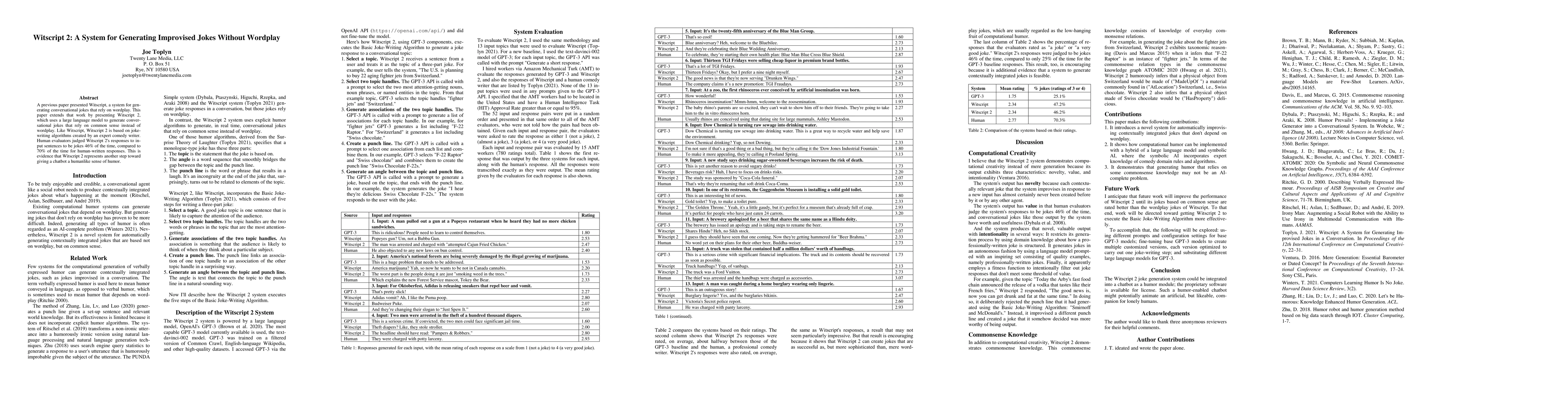 Witscript 2 advances joke-generation technology by using a large language model to create conversational jokes based on common sense rather than wordplay, showing a 46% success rate in human evaluations compared to 70% for human-written jokes. This represents progress in endowing chatbots with a more humanlike sense of humor.