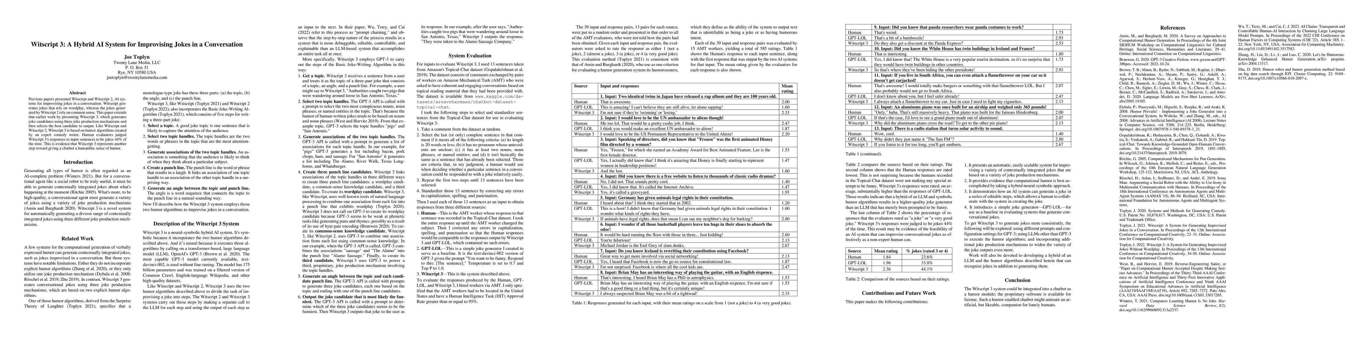 Witscript 3 is an advanced AI system that generates jokes using three distinct mechanisms: wordplay, common sense, and a hybrid approach. Human evaluators found 44% of its responses to be humorous, indicating progress in creating chatbots with a humanlike sense of humor.